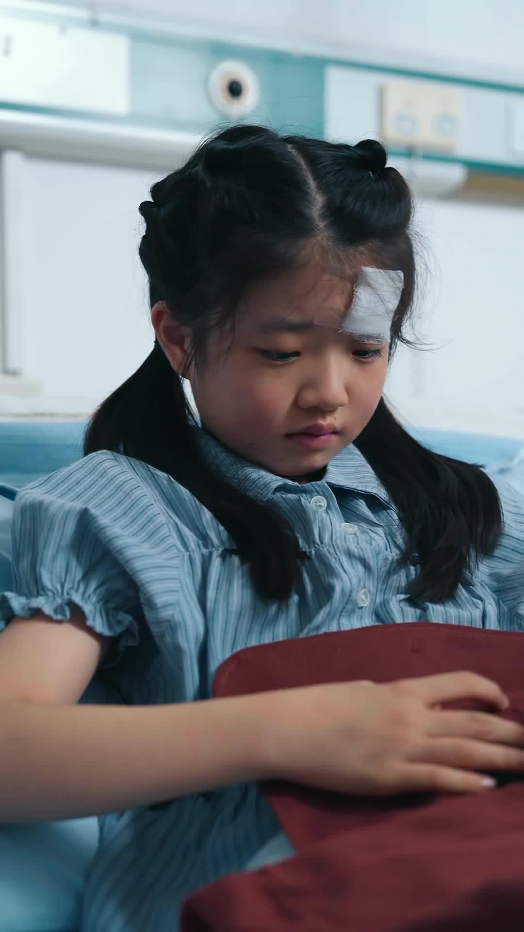 In the sterile, pale-blue glow of Room 34 at Jiangnan General Hospital, a quiet storm is brewing—not from beeping monitors or rushing nurses, but from the silence between three girls and two adults who orbit them like planets caught in an unstable gravitational field. The central figure, Xiao Yu, lies propped up on hospital pillows, her forehead wrapped in a clinical white gauze patch that looks less like medical care and more like a seal—something meant to contain what’s beneath. Her striped blue dress, modest and schoolgirl-precise, contrasts sharply with the deep maroon satchel resting across her lap, its flap slightly open, revealing a glimpse of something colorful: a child’s drawing? A folded letter? A photograph? Whatever it is, it’s the only thing she touches with real intention throughout the sequence—her fingers tracing the edge of the bag as if it were a lifeline, not a possession.