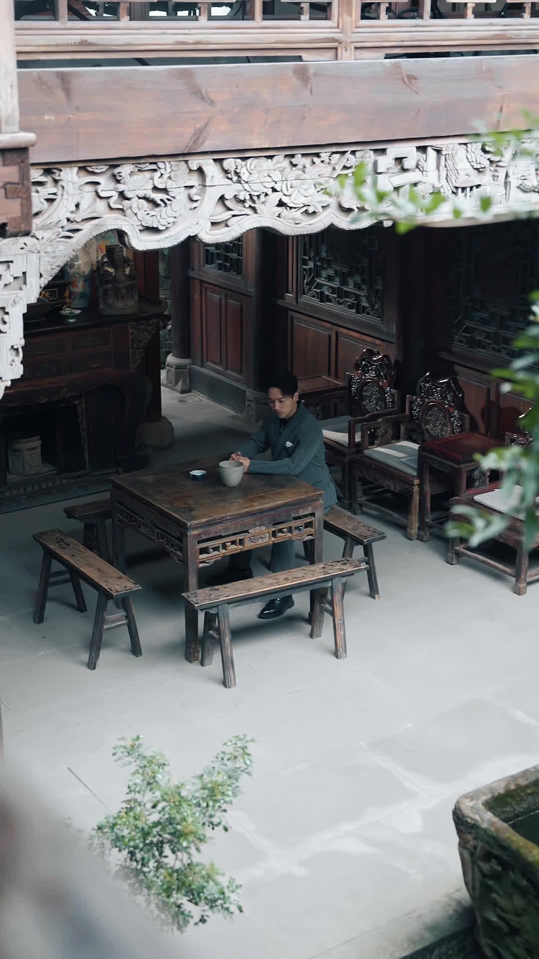 In the quiet courtyard of an old Jiangnan-style mansion, where carved wooden beams whisper centuries of family secrets and potted bonsai trees stand like silent witnesses, a scene unfolds that feels less like scripted drama and more like stolen footage from someone’s buried memory. The man—Li Zeyu, impeccably dressed in a charcoal-gray double-breasted suit with subtle pinstripes, a silver-and-black striped tie pinned with a discreet lapel clip, and a folded white handkerchief bearing a geometric pattern tucked into his breast pocket—sits alone at a low, weathered table. His posture is composed, almost regal, yet his fingers rest lightly on the rim of a simple ceramic teacup, as if he’s been waiting not for tea, but for something far more fragile: an apology, a confession, or perhaps just the courage to speak. The courtyard floor is smooth stone, slightly damp, reflecting the soft afternoon light filtering through the latticed windows behind him. A moss-covered stone basin sits near the edge of frame, half-submerged in shadow, its surface cracked and ancient—like the unspoken history between him and the two girls who now step into view.