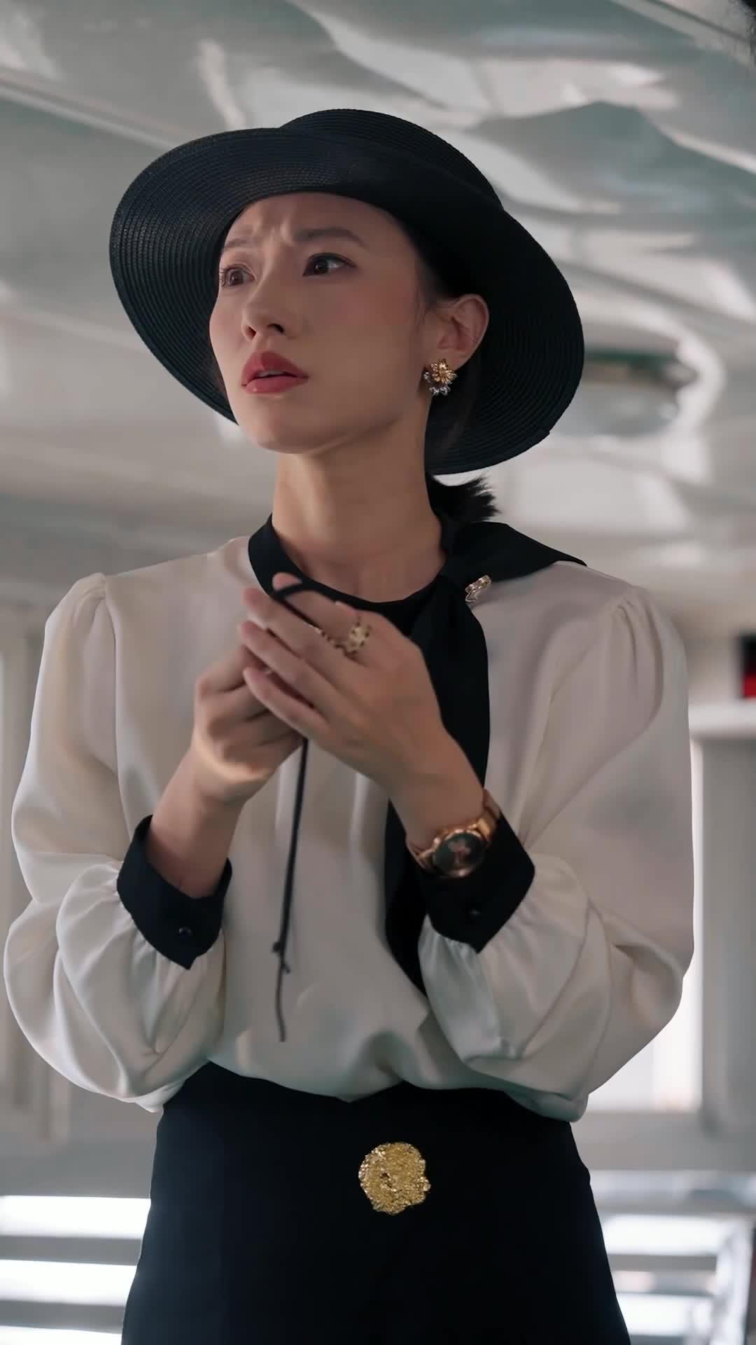 The ferry glides across the river, its red hull cutting through murky water like a blade of memory—slow, deliberate, heavy with unspoken history. Inside, the air hums with the low murmur of passengers, the clatter of metal benches, and the occasional sigh that escapes someone who’s been holding their breath too long. This is not just transport; it’s a stage suspended between shores, where lives intersect for minutes, sometimes seconds, and yet—some moments stretch into lifetimes. In this confined space, we meet Lin Xiao, the woman in the black hat, white blouse, and gold brooch—a figure carved from elegance and restraint. Her posture is upright, her hands clasped before her like she’s praying or preparing to strike. She wears pearls along the brim of her hat, not as ornamentation but as armor. Every gesture is measured: the way she adjusts the black ribbon at her collar, the slight tilt of her head when listening, the way her eyes flicker—not with curiosity, but with calculation. She is not merely observing; she is cataloging. And when she finally speaks, her voice is soft, almost melodic, but carries the weight of someone who knows exactly what silence costs.
