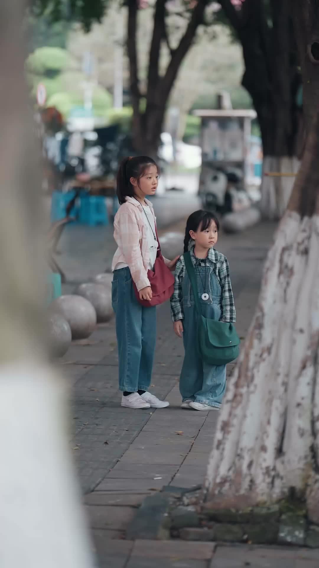The opening shot is deceptively simple: two girls on a sidewalk, trees framing them like actors under stage lights. Ling, with her ponytail tied high and her red satchel slung across her chest, stands tall—not arrogant, but braced. Xiao Yu, beside her, fidgets with the strap of her green bag, her braid swinging slightly with each nervous shift. They are not tourists. They are pilgrims. The background blurs—vendors, scooters, the murmur of daily life—but the girls remain in focus, sharp as daguerreotypes. This is not a casual stroll. This is a mission. And the camera knows it. It lingers on Ling’s hands, resting at her sides, knuckles pale. She’s holding something inside her fist. Not a weapon. A secret.