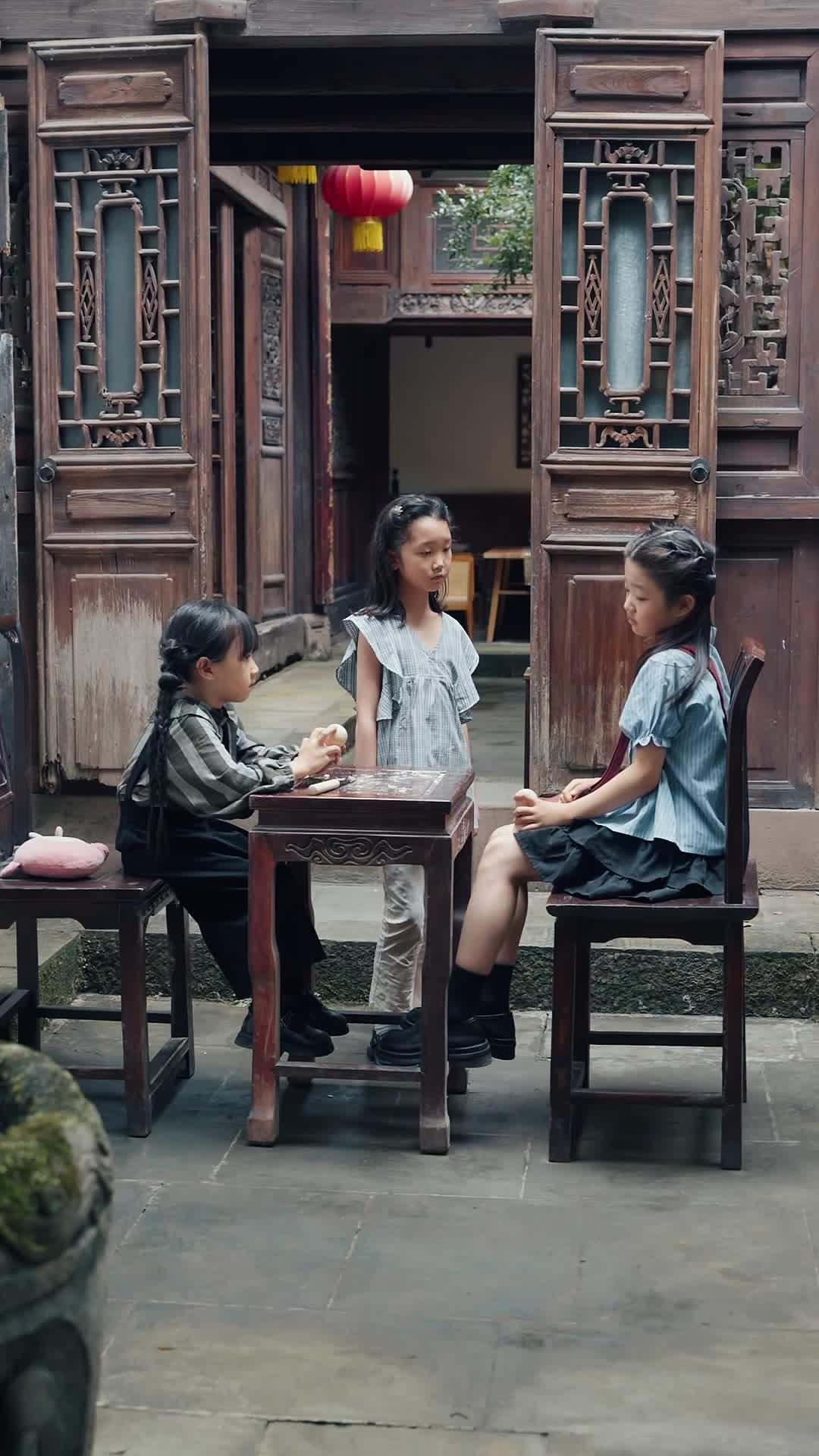 There’s a particular kind of stillness that settles over a courtyard when children stop playing and start negotiating reality. Not with rules or referees, but with body language so precise it could be choreographed—except it’s not. It’s real. Raw. Unrehearsed. In this fragment of To Mom's Embrace, we’re dropped into the middle of such a moment: three girls, one table, and a lump of clay that might as well be a crown, a weapon, or a confession. The setting is deceptively serene—aged wood, intricate carvings, a hanging lantern casting soft amber light—but beneath that tranquility pulses a current of adolescent intensity, the kind that makes adults instinctively step back and whisper, ‘Let them work it out.’