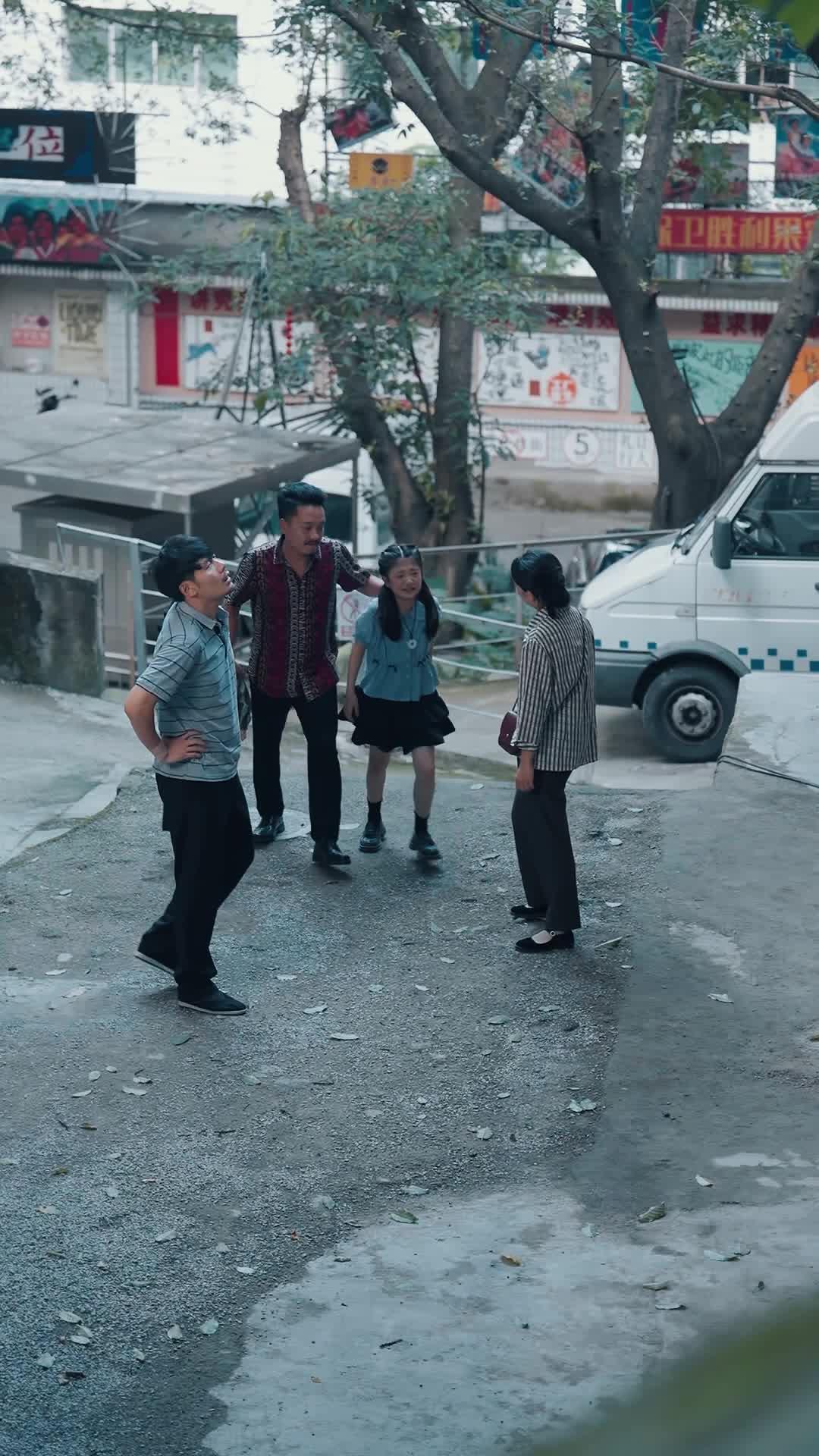 Back in the alley, the dynamics shift like tectonic plates. Zhou Tao, the man in the flamboyant batik shirt, suddenly seems less like a guardian and more like a courier. He adjusts Xiao Yu’s position on his hip, his smile tightening at the edges. He knows the call changes everything. And Mother Lin—poor, exhausted Mother Lin—finally breaks. Not with a wail, but with a shudder, her hand flying to her mouth, her shoulders heaving in silent convulsions. She doesn’t cry for herself. She cries for the future she can no longer shape. Her striped blouse, once a symbol of practicality, now looks like a prison uniform. And when she reaches for Xiao Mei again, her fingers brushing the girl’s sleeve, Xiao Mei doesn’t pull away. Not this time. She lets her mother hold her, just for a second, just long enough to imprint the feeling of safety—because she knows, with the chilling clarity only children possess, that it won’t last.