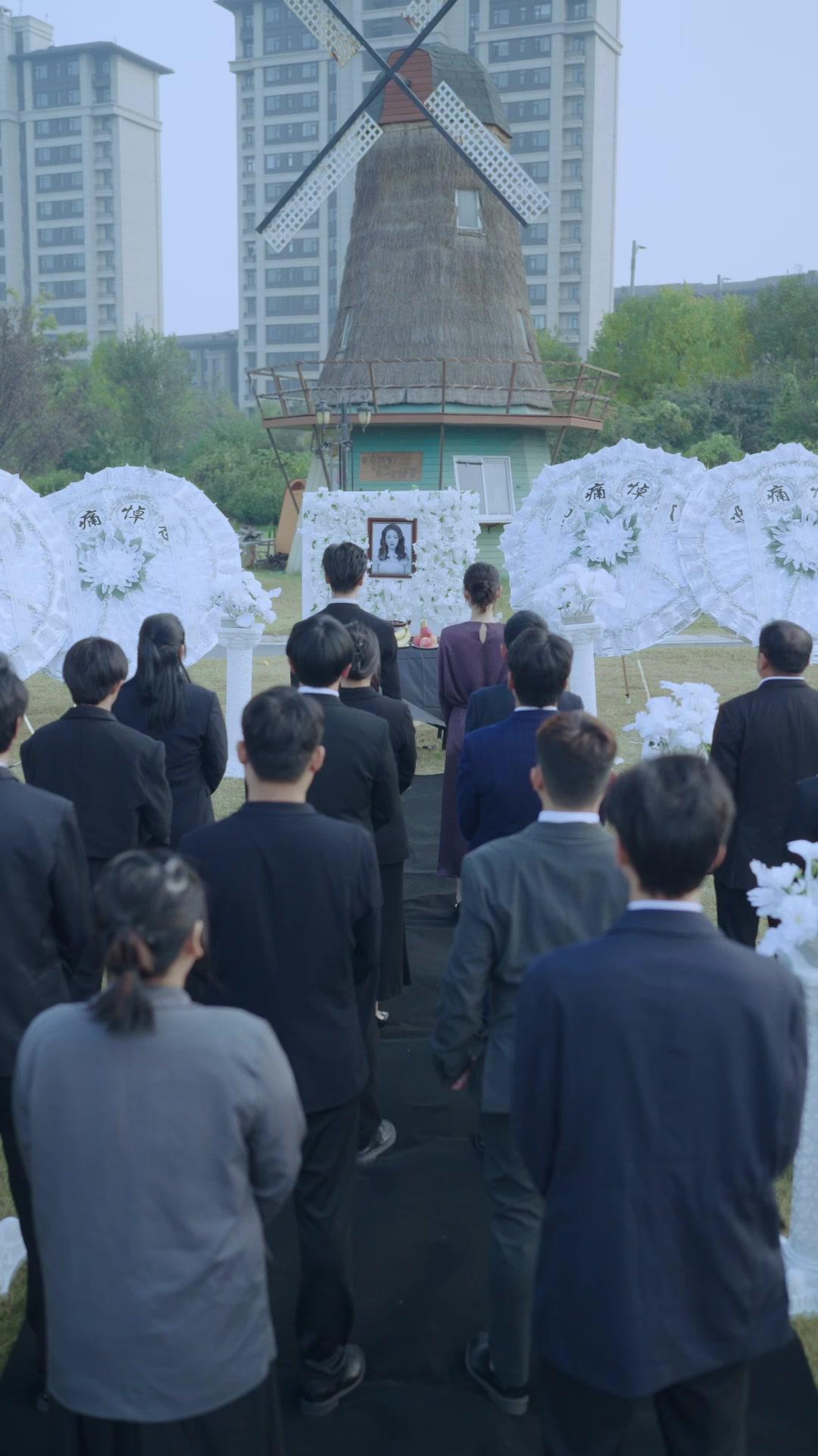 From the very first frame, the visual language tells us this isn’t ordinary. The windmill in the background isn’t decorative—it’s symbolic. A structure built to harness wind, to turn force into motion. But here, it stands still, rusted, irrelevant. Like Lin Wei himself: once functional, now inert, caught between past momentum and present paralysis. The white wreaths—each one inscribed with characters meaning ‘eternal sorrow’—are arranged like sentinels, framing the portrait of the deceased, a woman named Mei Ling, whose photograph is the only color in an otherwise desaturated palette. Her eyes are open. Not vacant. *Accusing*. And everyone knows it. Even the guests, dressed in muted tones, keep their distance from the altar, as if afraid the grief might be contagious—or worse, *infectious*.