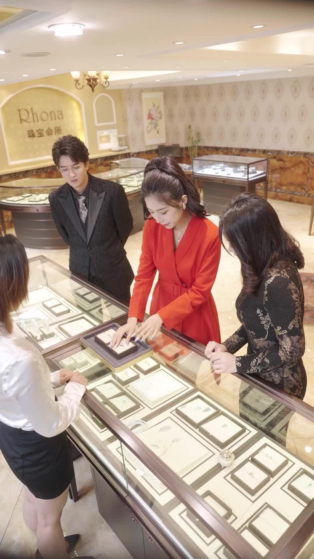 The sequence begins innocuously: Lin Xiao lifts a velvet tray, fingers hovering over a solitaire diamond set in platinum. Madame Chen leans in, her voice low and melodic, offering commentary on cut and carat—but her gaze flickers toward Zhou Wei, who suddenly covers his mouth, as if stifling a cough or a laugh. It’s the first crack in the veneer. Then he steps back, pulls out his phone, and answers a call—not with urgency, but with theatrical resignation. His gestures are exaggerated: one hand pinching the bridge of his nose, the other clutching the phone like a lifeline to another world. He speaks in hushed, rapid bursts, his lips moving in sync with invisible scripts. Meanwhile, Lin Xiao, undeterred, slips a ring onto her finger—*the* ring, the one with the halo of smaller stones surrounding a central pear-cut stone—and turns her hand slowly, deliberately, letting the light catch every facet. Her smile widens, but her eyes remain fixed on Madame Chen, searching for validation. When Madame Chen finally reacts—not with awe, but with a slow, skeptical tilt of the head—Lin Xiao’s expression doesn’t falter. Instead, she doubles down, lifting her hand higher, rotating it like a trophy. The camera lingers on her fingers: the manicure is flawless, the ring dazzling, yet something feels off. The way she holds her wrist—too stiff, too posed—suggests she’s rehearsed this moment a hundred times in front of a mirror.