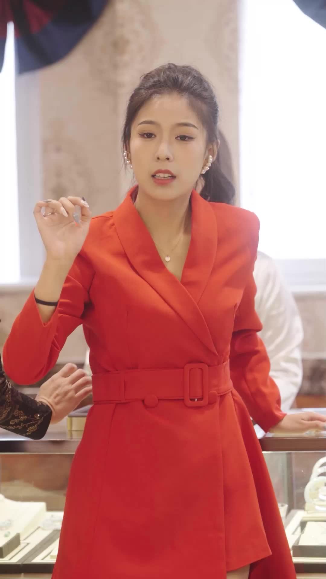 In a lavishly appointed jewelry boutique—marble floors gleaming under ornate chandeliers, glass display cases lined with emerald-encrusted lockets and platinum bands—the air hums not just with luxury, but with unspoken tension. This is not merely a shopping trip; it’s a ritual of power, identity, and inheritance. At its center stands Lin Xiao, draped in a bold crimson wrap dress cinched at the waist with a structured belt, her hair swept into a high ponytail that frames a face both composed and quietly defiant. Her nails are long, sculpted, and painted in a muted silver-gray—elegant, deliberate, almost weaponized. She wears a single pearl pendant, modest yet symbolic, like a quiet rebellion against the ostentation surrounding her. When she lifts her left hand, revealing a diamond ring so large it catches the light like a captured star, the room shifts. Not because of the stone’s carat weight—but because of who placed it there, and why.