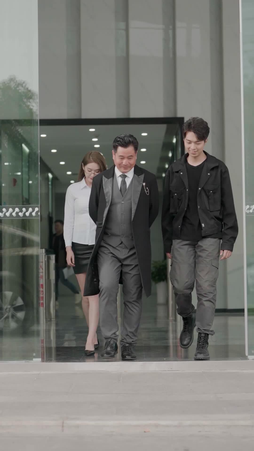 The first ten seconds of *True Heir of the Trillionaire* establish a visual grammar that lingers long after the screen fades: three people stepping out of a modernist building, sunlight catching the edges of their clothing, their shadows stretching across the pavement like ink spilled on paper. Lin Feng, in his black utility jacket and cargo pants, walks with the easy confidence of someone who’s never been told he doesn’t belong—even as the architecture around him screams exclusivity. Beside him, Mr. Jiang, older, heavier-set, radiating paternal authority in his layered suit, seems to carry the weight of decades in his posture. And behind them, Zhou Ling, glasses perched delicately on her nose, white shirt crisp, black skirt fitted—not subservient, but observant. She doesn’t walk *with* them; she walks *between* them, a living hinge connecting two worlds. This isn’t a meeting. It’s a reckoning disguised as a casual stroll.