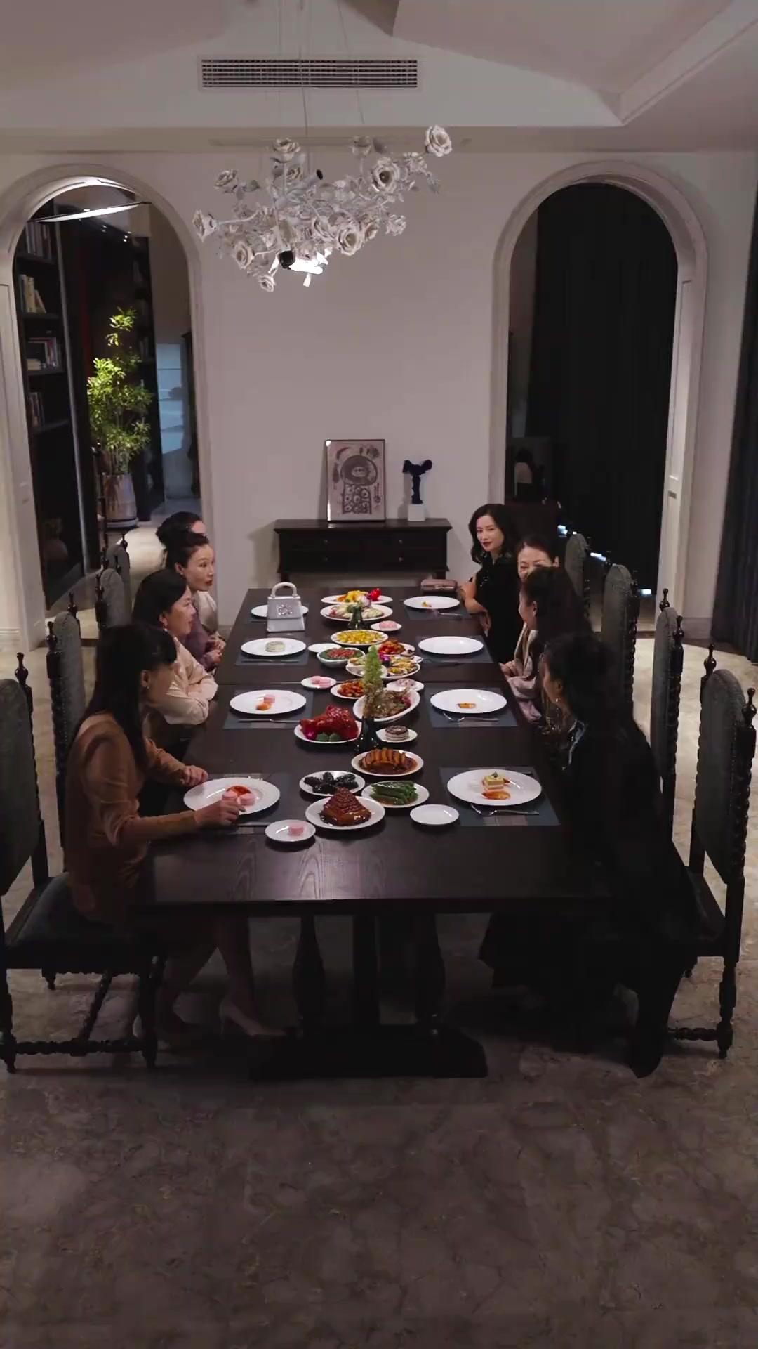 In the dim glow of a chandelier shaped like frozen blossoms, eight women gather around a long, dark wooden table—each plate a stage, each fork a weapon, each glance a silent declaration. This is not dinner. This is diplomacy with dessert. The setting is opulent but restrained: arched doorways frame shadows, bookshelves whisper intellectual pretense, and a single white ceramic cat perches on a shelf like a silent judge. At the head of the table sits Lin Mei, draped in black velvet studded with pearls, her diamond necklace catching light like a blade drawn slowly from its sheath. She does not speak first. She doesn’t need to. Her posture—arms folded, chin lifted, lips painted crimson—is a language older than words. Across from her, Chen Yu, in a shimmering plum gown that catches every flicker of candlelight, smiles too wide, too fast, as if trying to outrun her own nerves. Her fingers tap the rim of her water glass in a rhythm only she hears. Between them, the air hums with unspoken history—betrayals buried under layers of silk, alliances forged over shared trauma, and debts that never appear on any ledger.