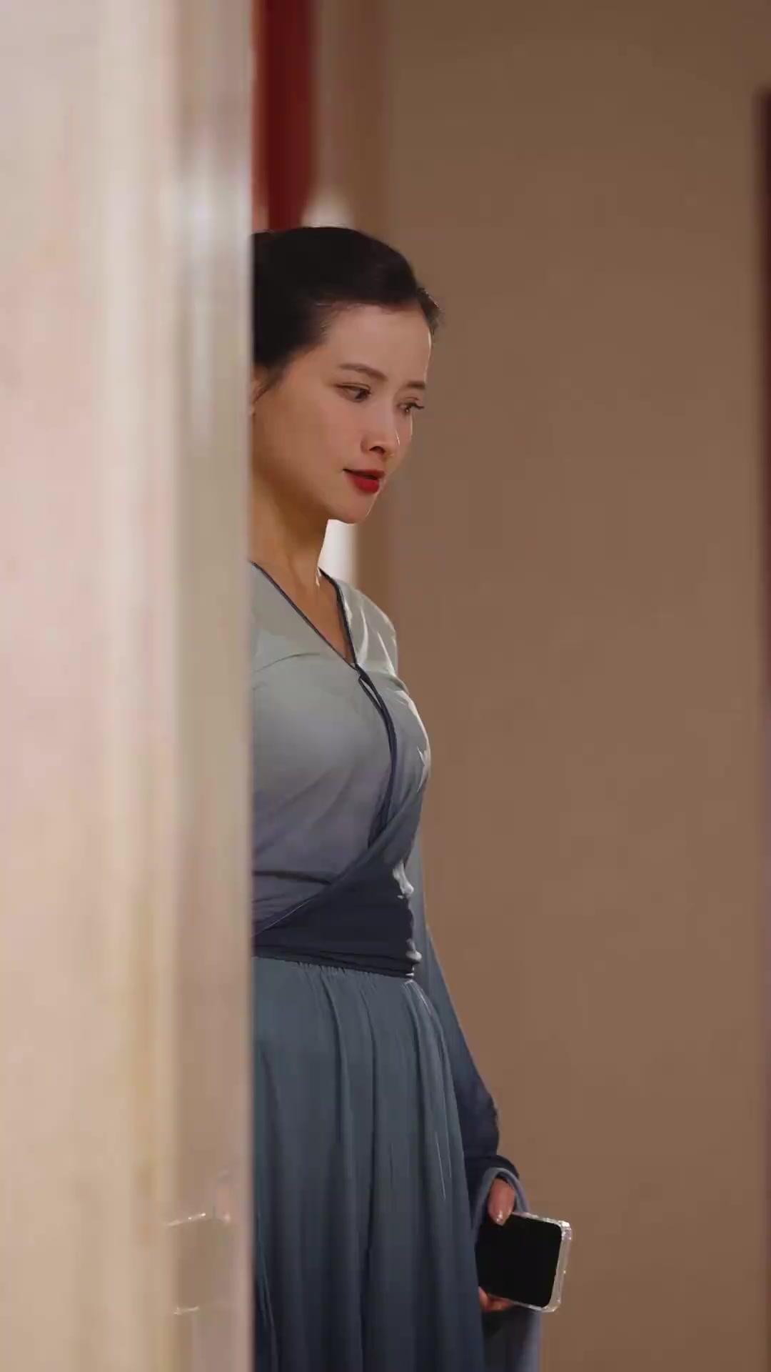 The opening shot is a masterclass in visual irony: Shen Suyun, clad in a gown that fades from sky-blue to deep ocean, peeks from behind a column like a character caught mid-scene in a classical painting—except this isn’t artifice; it’s anxiety made visible. Her posture is rigid, her gaze darting, her lips pressed into a line that suggests she’s been holding her breath for hours. The phone in her hand isn’t just a device; it’s a talisman, a shield, a conduit for whatever storm is brewing beyond the frame. When she finally steps forward, the camera follows her like a shadow, emphasizing how small she seems in the vast, empty corridor. This isn’t a setting—it’s a psychological landscape. The walls are warm-toned, inviting, yet sterile. There’s no echo, no sound except the faint hum of distant activity. She is alone, even when surrounded by architecture designed for gathering. That’s the first clue: this woman lives in a world built for performance, but she’s forgotten how to perform *herself*.