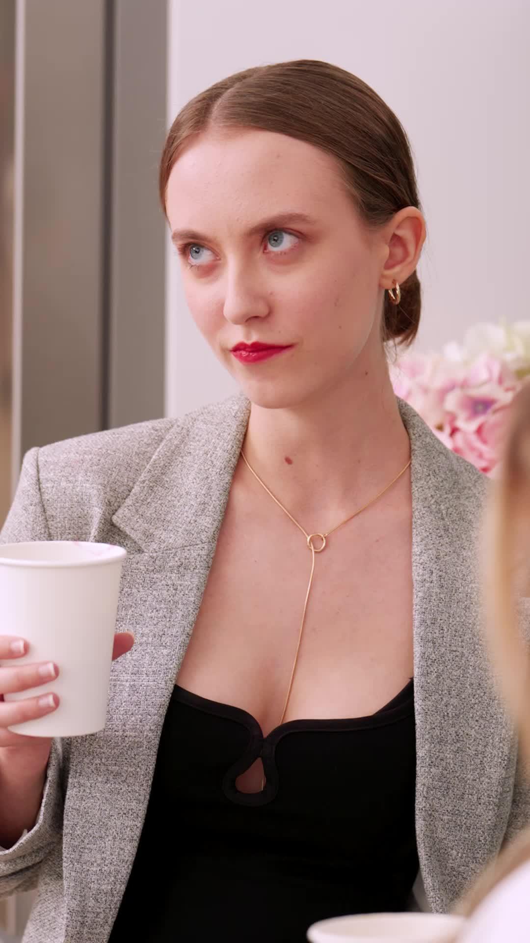 Let’s talk about what *isn’t* said in *Twins Love Trap for Billionaire Dad*—because that’s where the real story lives. The first ten seconds of the video don’t feature a single line of dialogue, yet they tell us more about Eleanor, Lila, and Clara than ten pages of exposition ever could. Eleanor, in her grey blazer and minimalist gold jewelry, sips from a paper cup like it’s a ceremonial chalice. Her nails are manicured, her posture impeccable, but her eyes—those pale blue eyes—keep flicking toward the doorway. She’s not nervous. She’s *anticipating*. There’s a rhythm to her movements: inhale, pause, sip, glance. It’s choreographed. She’s not just in the room—she’s conducting it.