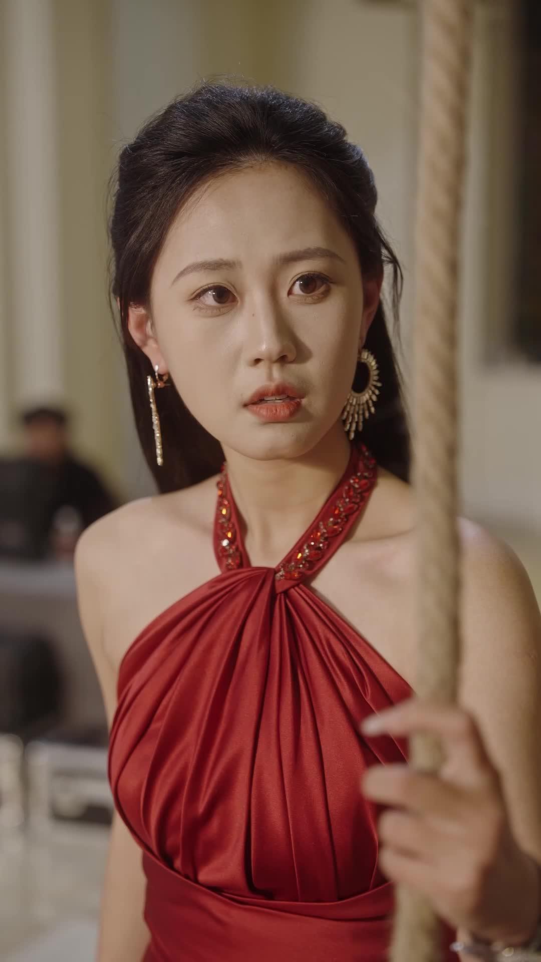 In the opening frames of Veiled Justice, a woman in a crimson halter-neck gown stands gripping a thick rope—her fingers tense, her gaze flickering between defiance and dread. Her earrings, sunburst-shaped and glittering, catch the ambient light like warning flares. This isn’t just fashion; it’s armor. The dress, richly draped at the bust with jeweled neckline detailing, suggests opulence—but the way she clutches that rope tells another story entirely. She’s not posing for a gala; she’s bracing for confrontation. Behind her, blurred figures move indistinctly, but their presence looms like background static in a high-stakes transmission. One man in a pale pink double-breasted suit appears briefly—his expression shifting from mild confusion to sharp alarm, as if he’s just realized the script has changed mid-scene. His tie, patterned in muted burgundy and cream, matches the tone of the room’s decor: elegant, restrained, yet charged with unspoken tension. That’s the genius of Veiled Justice—it doesn’t shout its stakes. It whispers them through posture, fabric, and the subtle tremor in a wrist.