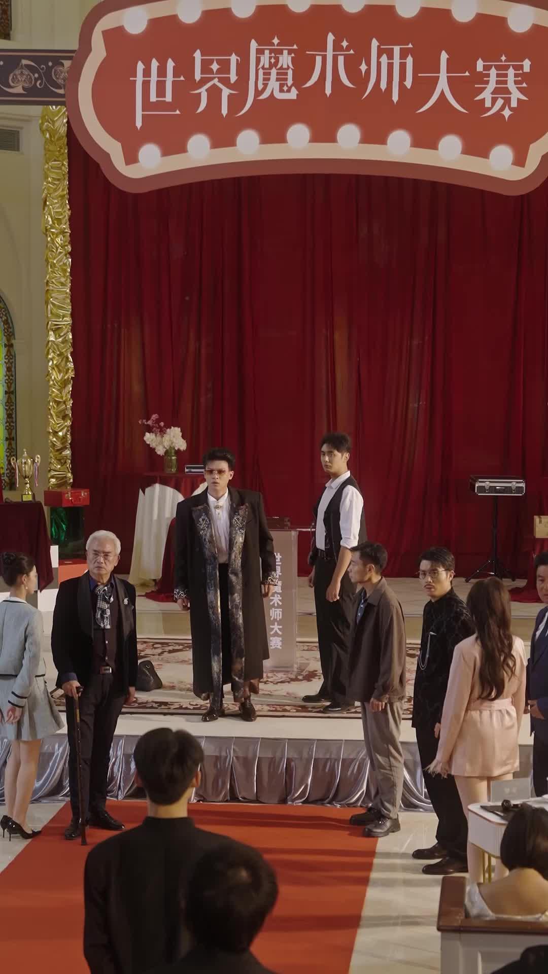 The setting—ostensibly a magician’s tournament—is deliberately misleading. The banner reads ‘World Magician Championship’, but the energy is closer to a mafia induction or a royal succession dispute. There’s no rabbit in a hat here; there’s a knife hidden in the sleeve. The men in black trench coats aren’t assistants—they’re enforcers. Their mirrored surfaces reflect not the room, but the faces of those who dare to look too closely. And Lin Zeyu? He’s not performing tricks; he’s conducting a symphony of intimidation. His sunglasses stay on indoors, not because of vanity, but because he refuses to be seen *seeing*. Every time he tilts his head, you catch the glint of gold at his collar—a pendant shaped like an eye, embedded with a green stone that seems to shift color under different lights. Is it a talisman? A tracker? In Veiled Justice, even jewelry has agenda.