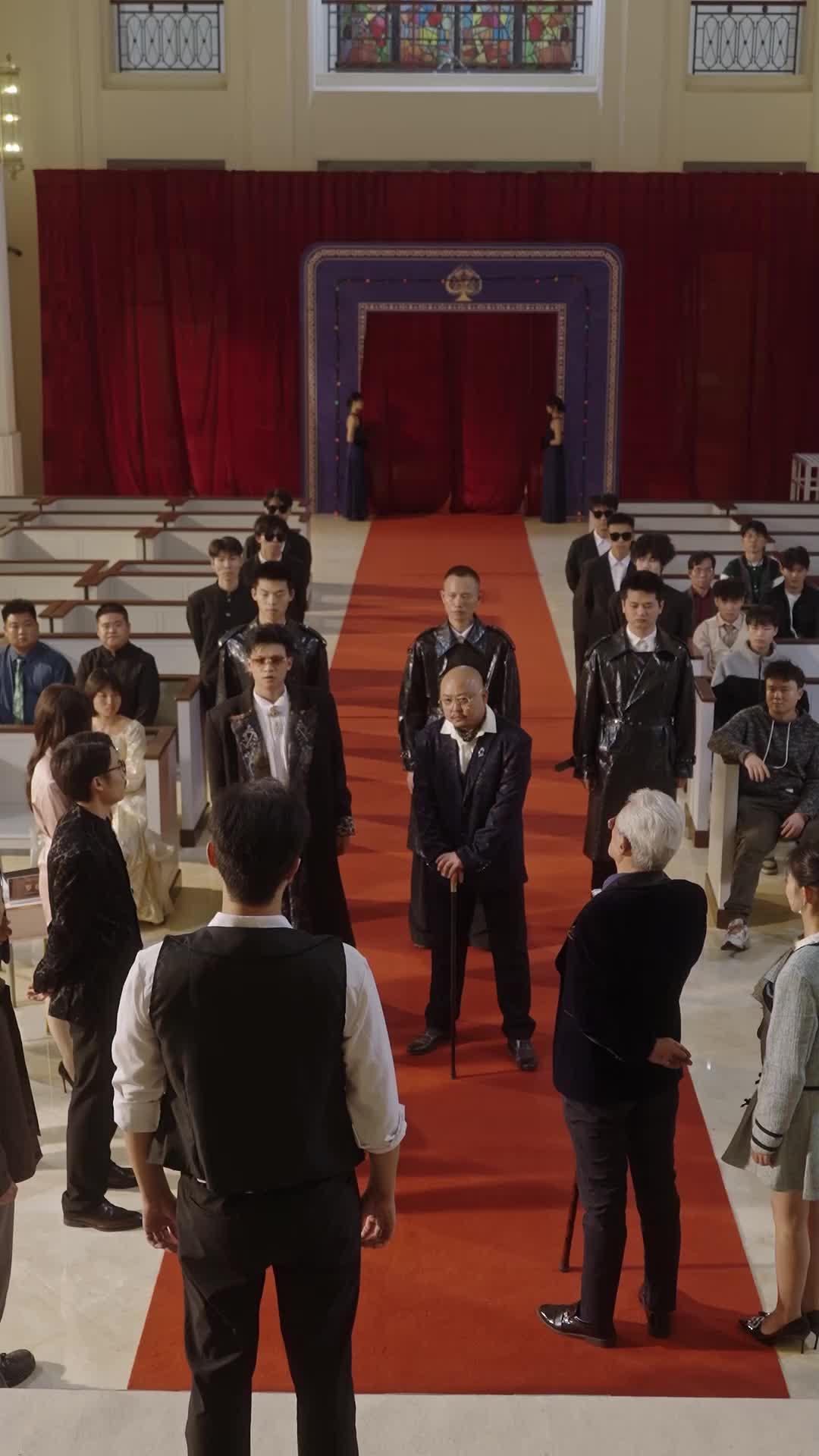 The architecture of the hall reinforces this tension. Stained-glass windows depict saints and martyrs, their faces serene, their hands raised in blessing—while below, men plot and accuse and threaten. The irony is suffocating. The red carpet is not a path to celebration; it is a runway to exposure, each step bringing Li Wei closer to either vindication or annihilation. At 1:05, when he lunges—not violently, but with the desperate energy of a man who has run out of time—the camera shakes slightly, as if the building itself is unsettled. The guards do not react immediately. They wait for a signal. That hesitation is the most damning detail of all: loyalty is conditional, obedience is transactional. In *Veiled Justice*, no one is truly loyal to principle. They are loyal to survival.