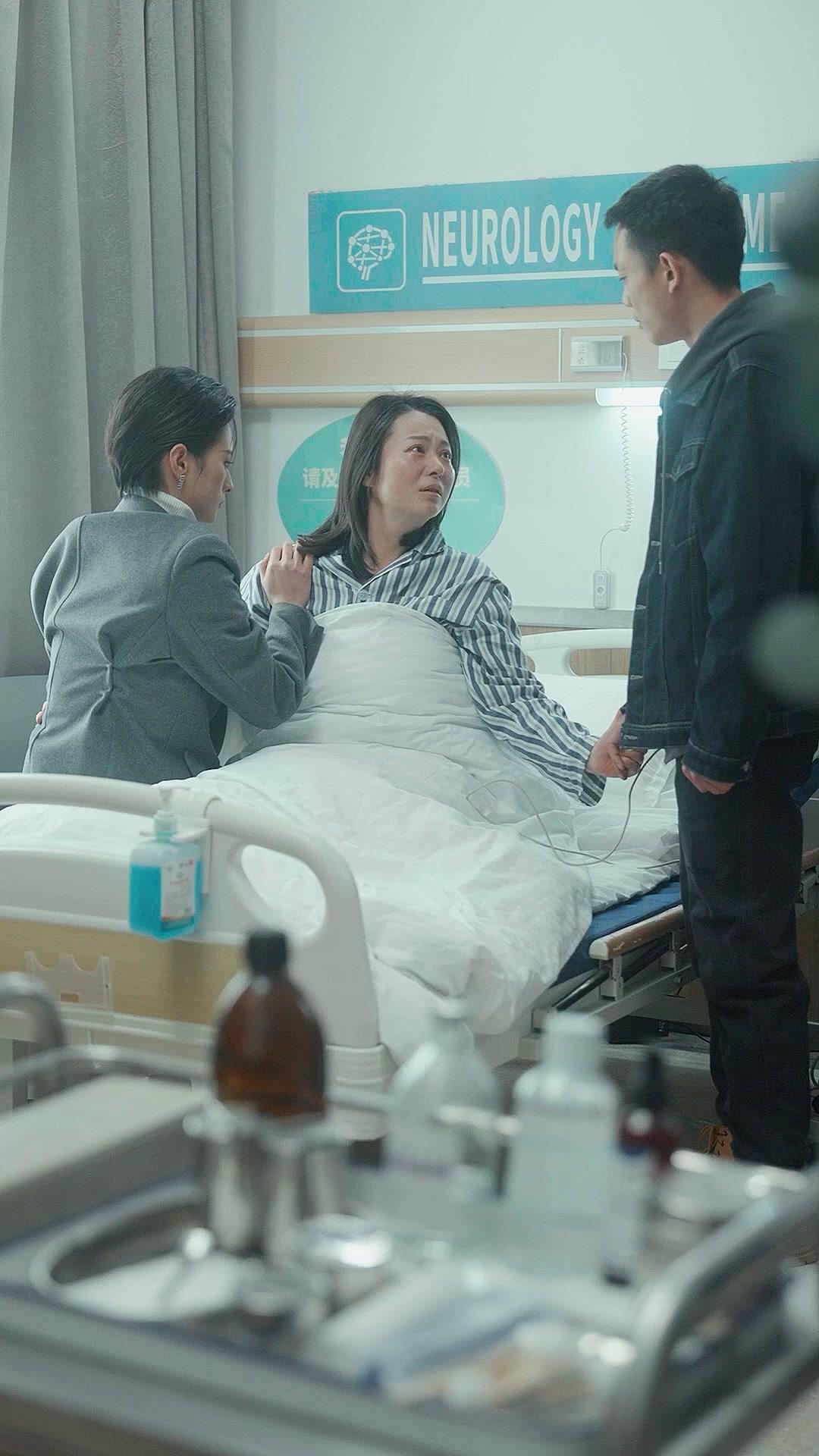 In the sterile, pale-lit corridor of a neurology ward—where the air hums with the quiet dread of uncertainty—three people orbit one hospital bed like planets caught in a collapsing gravitational field. This isn’t just a medical drama; it’s a slow-motion emotional detonation disguised as a conversation. The woman in the striped pajamas—let’s call her Lin Mei, though the name isn’t spoken aloud—isn’t merely ill. She’s *unraveling*, thread by thread, under the weight of something far heavier than diagnosis: guilt, betrayal, and the unbearable clarity that comes when truth finally breaches the surface. Her eyes, red-rimmed and swollen, don’t just weep—they *accuse*. Every blink is a question she can’t voice but everyone feels. She grips the white sheet like it’s the last raft on a sinking ship, her knuckles bleached bone-white, while her left hand—trembling, unsteady—reaches out not for comfort, but for confirmation. Confirmation that what she suspects is real. That the man standing beside her, in his denim jacket over a hoodie, isn’t just visiting. He’s *involved*.
