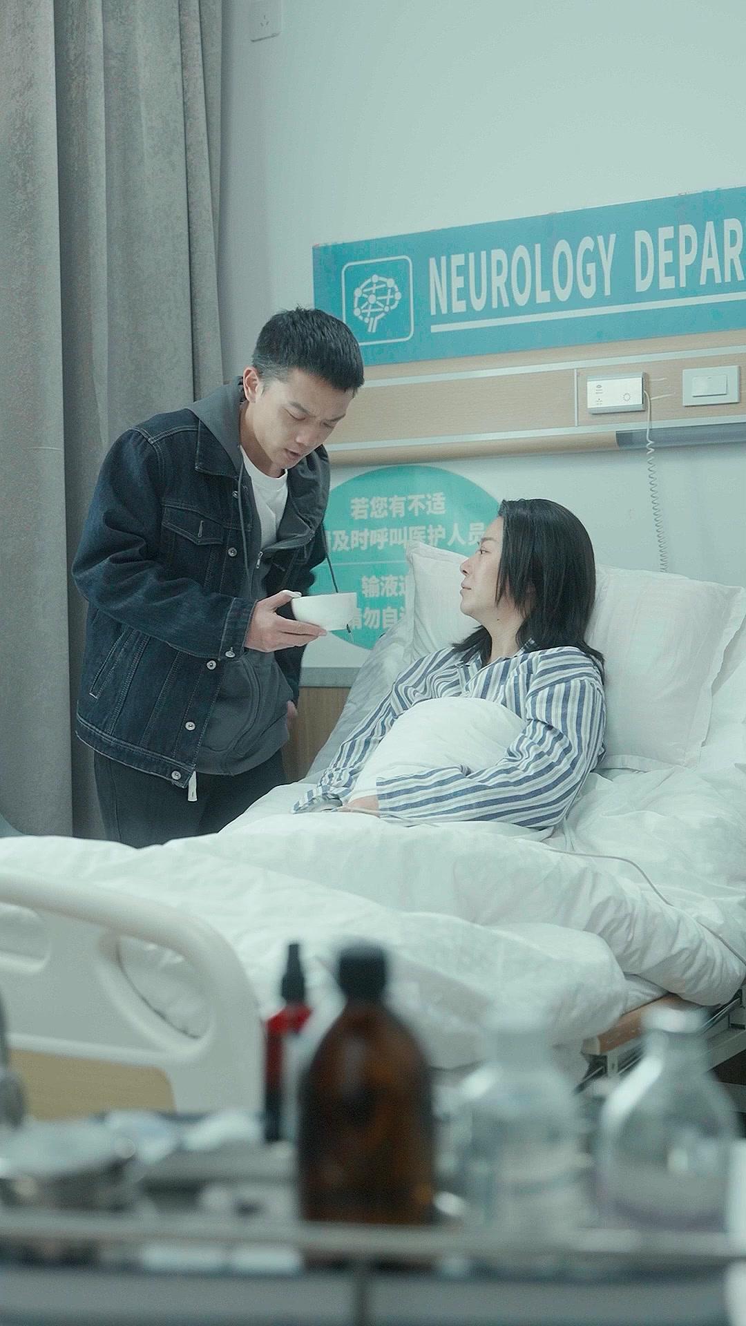 In the opening frames of this emotionally layered short film, we’re dropped straight into the sterile quiet of a neurology ward—white sheets, muted lighting, the faint hum of medical equipment. A man in a denim jacket over a hoodie, his hair cropped short and eyes heavy with exhaustion, stands beside a hospital bed where a woman lies propped up on pillows, wearing striped pajamas that look more like a uniform than sleepwear. Her face is pale but composed; her hands, wrapped around a small white bowl, tremble just slightly—not from weakness, but from restraint. This is not a scene of crisis, but of containment. The man, let’s call him Li Wei for now (a name whispered in later dialogue), offers her the bowl, then pulls out his phone. Not to scroll mindlessly, but to show her something. His fingers tap once, twice—then he turns away, stepping toward the curtain, phone pressed to his ear. His voice is low, urgent, almost pleading. She watches him go, her expression unreadable, yet her grip on the bowl tightens. When he returns, he leans in, speaking quickly, gesturing with his free hand as if trying to convince her of something she already knows. She doesn’t flinch. She simply looks at him, then down at the bowl, then back at him—her silence louder than any argument. That moment, frozen between duty and desire, is the core of *When Duty and Love Clash*. It’s not about whether he loves her—it’s about what he’s willing to sacrifice *for* her, and whether she’ll let him. The sign above the bed reads ‘NEUROLOGY DEPARTMENT’ in bold blue letters, but the real diagnosis isn’t written on the wall—it’s etched into the space between them. A pulse oximeter glows faintly on her finger, a tiny blue light blinking like a heartbeat monitor for their relationship. Every time he steps away, the camera lingers on her face—not sad, not angry, just waiting. Waiting for him to choose. Waiting for herself to decide if she’ll let him carry the weight alone. And when he finally walks out of frame, leaving her alone with the bowl and the silence, the audience holds its breath. Because we’ve all been there: standing at the edge of someone else’s pain, knowing the right thing to do, but unsure if doing it will break you both.