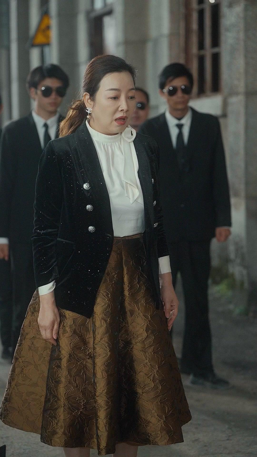 The opening shot of the short film—Li Wei striding forward in a black velvet blazer studded with silver buttons, her golden brocade skirt swaying like a banner of authority—sets the tone for a world where power is worn like armor. Behind her, two men in identical black suits and sunglasses move in synchronized silence, their presence less like bodyguards and more like extensions of her will. This isn’t just a walk down an alley; it’s a procession of control, of consequence. And yet, within three seconds, the illusion shatters. A sudden cut reveals Chen Yu—short hair, sharp cheekbones, lips parted in shock—as she’s lifted off the ground by a man in a beige coat and wire-rimmed glasses. Her arms wrap around his neck not in affection, but in desperation. His expression? Not triumph, but terror. He’s not carrying her to safety—he’s fleeing *with* her, as if she’s both his burden and his only lifeline. That single sequence tells us everything: this is not a romance. It’s a hostage scenario disguised as intimacy, a collision between duty and love so violent it fractures the frame itself.