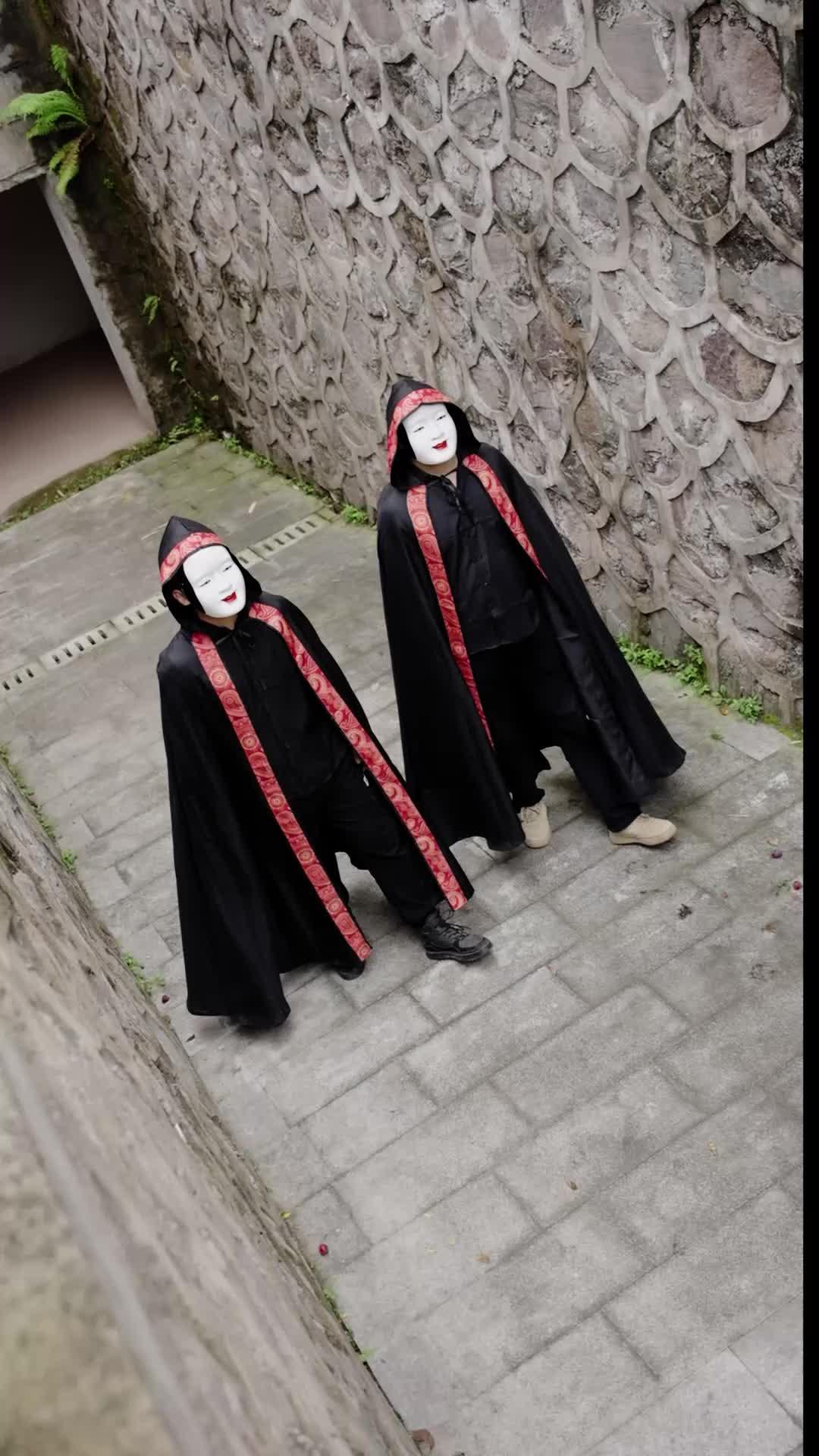 Two cloaked figures, identical masks, synchronized menace—Clash of Light and Shadow nails visual storytelling. The protagonist’s micro-expressions? Gold. That moment he grabs the wrist? Not just action—he’s *negotiating fate*. Stone alley, trembling hands, silent stakes. Short, sharp, unforgettable. 🕊️⚔️