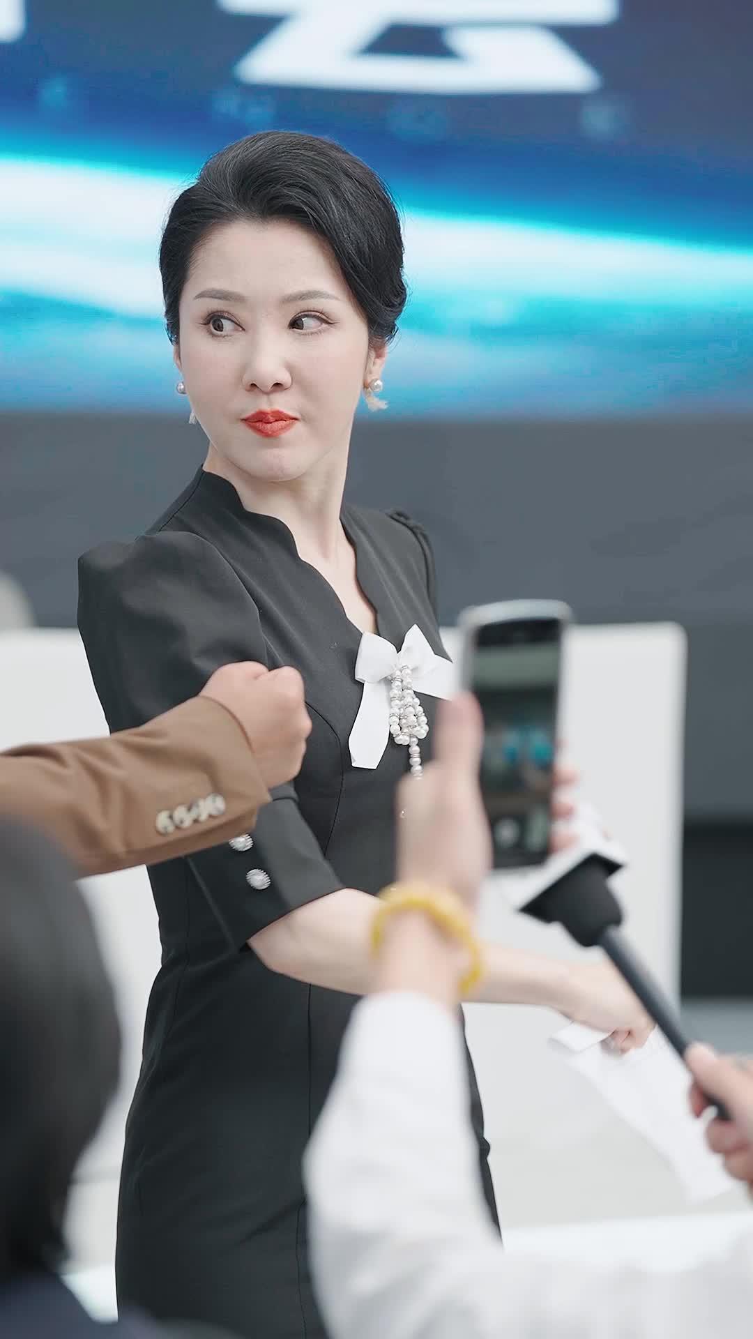The moment opens not with a speech, but with a bow—white silk, pearl-draped, pinned to the chest of Song Qing, the poised director of the Qingya Dance Academy. Her black dress is elegant, severe, almost ceremonial; her red lips are set like a verdict. Around her, microphones thrust forward like spears, cameras blink like fireflies in a storm. This isn’t just a press conference—it’s a stage where every gesture is a line, every glance a subplot. And then Jiang Huide enters—not with fanfare, but with a rustle of brown wool and a paisley cravat that screams vintage rebellion. His hands, adorned with gold rings and a deer-shaped lapel pin, move constantly: clapping, gesturing, adjusting, *performing*. He doesn’t speak first—he *acts* first. His eyes dart, his eyebrows lift, his mouth forms half-smiles that never quite land. He’s not nervous. He’s rehearsed. He’s playing a role so well, even he might believe it.