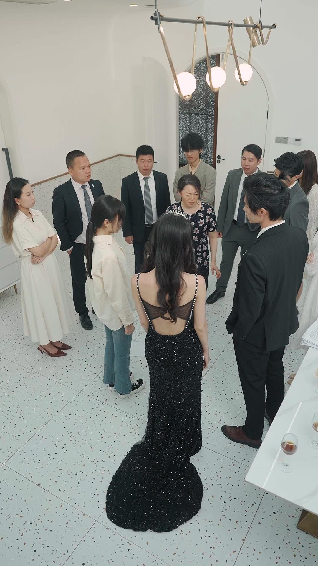 The scene opens with a circle. Not a ritual, not a meeting—just people standing in a ring, arms crossed, eyes darting, mouths shut. The floor is white tile with flecks of red and black, like dried blood and spilled ink. The chandelier above hangs crookedly, three globes swaying ever so slightly, as if disturbed by the tension below. This is not a party. This is a standoff dressed in formalwear. And at its center, Li Xinyue stands with her back to the camera—0:00—inviting us to see her not as a person, but as a symbol. Then she turns. And the world shifts.