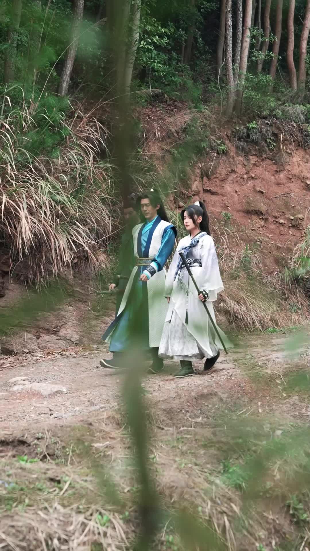 산길이 흙과 마른 풀로 덮인 이 장면은 단순한 이동이 아니라, 흠생전 속 인물들의 내면적 갈등이 겉으로 드러나는 순간이다. 먼저 등장하는 남성 캐릭터, 이름은 백서연(백서연)으로 추정되는 인물은 푸른색과 흰색이 조화된 전통 복장을 입고 있으며, 머리에는 금색 장식이 달린 간단한 관을 쓰고 있다. 그의 표정은 처음엔 무심해 보이지만, 카메라가 가까워질수록 눈빛 속에 미세한 긴장감이 스며들고 있다. 특히 그가 팔짱을 낀 자세를 취할 때, 손목에 감긴 검은 실과 흰 끈의 조합은 단순한 장식이 아니라, 어떤 약속이나 제약을 상징하는 듯하다. 그의 옆에 서 있는 여성 캐릭터, 유선영(유선영)은 흰 바탕에 연보라 물감이 번진 듯한 한복을 입고 있으며, 허리에 검은 띠를 두르고, 어깨 위로 흘러내리는 파란 천은 마치 운명의 실타래처럼 보인다. 그녀의 검은 머리는 높게 묶여 있고, 은색 비녀가 꽂혀 있는데, 이 비녀는 단순한 장신구가 아니라, 과거某个 사건과 연결된 중요한 아이템일 가능성이 크다. 두 사람이 함께 걸을 때, 유선영이 잠깐 고개를 돌려 백서연을 바라보는 순간, 그녀의 눈빛은 경계보다는 애정과 우려가 섞여 있다. 그러나 백서연은 시선을 피한다. 이 짧은 교류는 말 없이도 ‘그들 사이에 이미 무언가가 깨졌거나, 아직도 해결되지 않은 문제가 남아 있다’는 것을 암시한다.