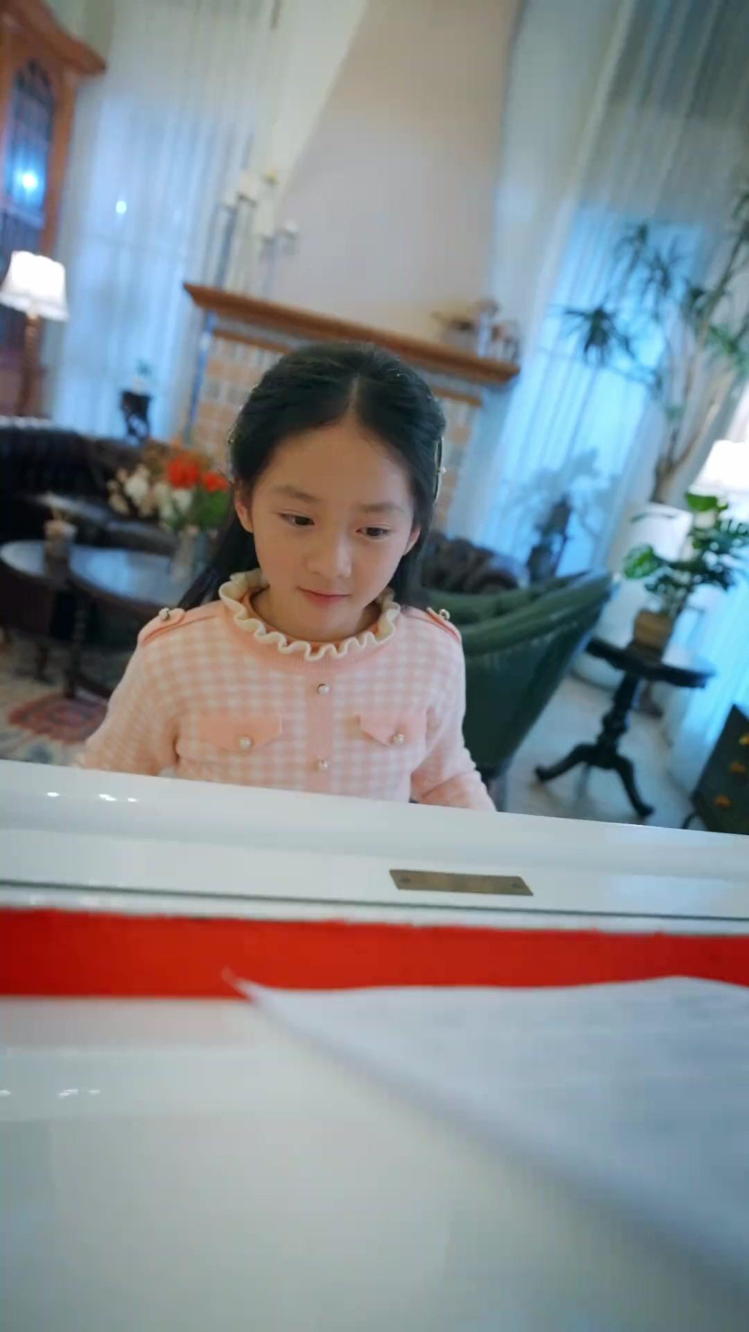 Bir evin iç mekânında, ışık dolu, klasik bir oturma odası. Duvarlar beyaz, perdelere vuran gün ışığı hafif mavi bir filtreyle içe doğru akıyor; sanki bu sahne bir çocuk masalının başlangıcı gibi sessiz ve zarif. Ortada beyaz bir piyano duruyor, üzerinde kırmızı bir şerit — belki de bir hediye, belki de bir sınır işareti. Piyano başında oturan küçük kız, pembe ekose bir takım elbise giymiş, saçlarında gümüş bir kelebek broş, yüzünde ise hem merak hem de biraz tedirginlik okunuyor. Elleri yavaşça klavyeye dokunurken, parmakları titreyerek ilk notayı basıyor. Bu an, sadece müzik değil, bir hayatın dönüm noktası gibi duruyor.