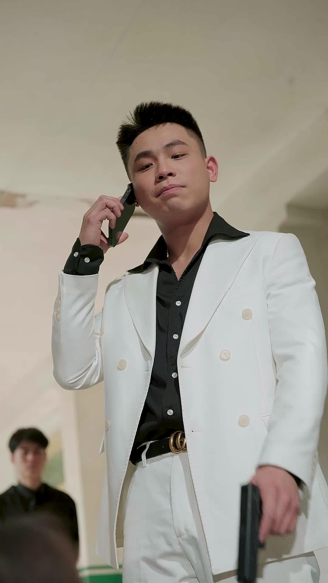 這段影像像一場被刻意剪輯過的懸念拼圖,每幀畫面都藏著未說出口的對話與壓抑的情緒。開場那位穿著挺括白西裝、內搭黑襯衫的男子——我們暫且稱他為「白少」——一手持手機貼耳低語,另一手卻穩穩握著一把黑色手槍,指節微屈,彷彿那不是武器,而是某種權力的延伸。他嘴角時而揚起,時而緊抿,眼神在冷峻與戲謔間流轉,像極了那些在港產黑幫片裡遊走於道德邊緣的「體面反派」。他腰間那條金色雙G腰帶,在灰白牆面映襯下閃出一絲奢華的刺眼光芒,彷彿在提醒觀眾:這不是街頭混混,是精心包裝過的危險。背景中模糊站立的黑衣人,並非閒角,而是他權力結構的具象化——沉默的守衛,無聲的威懾。