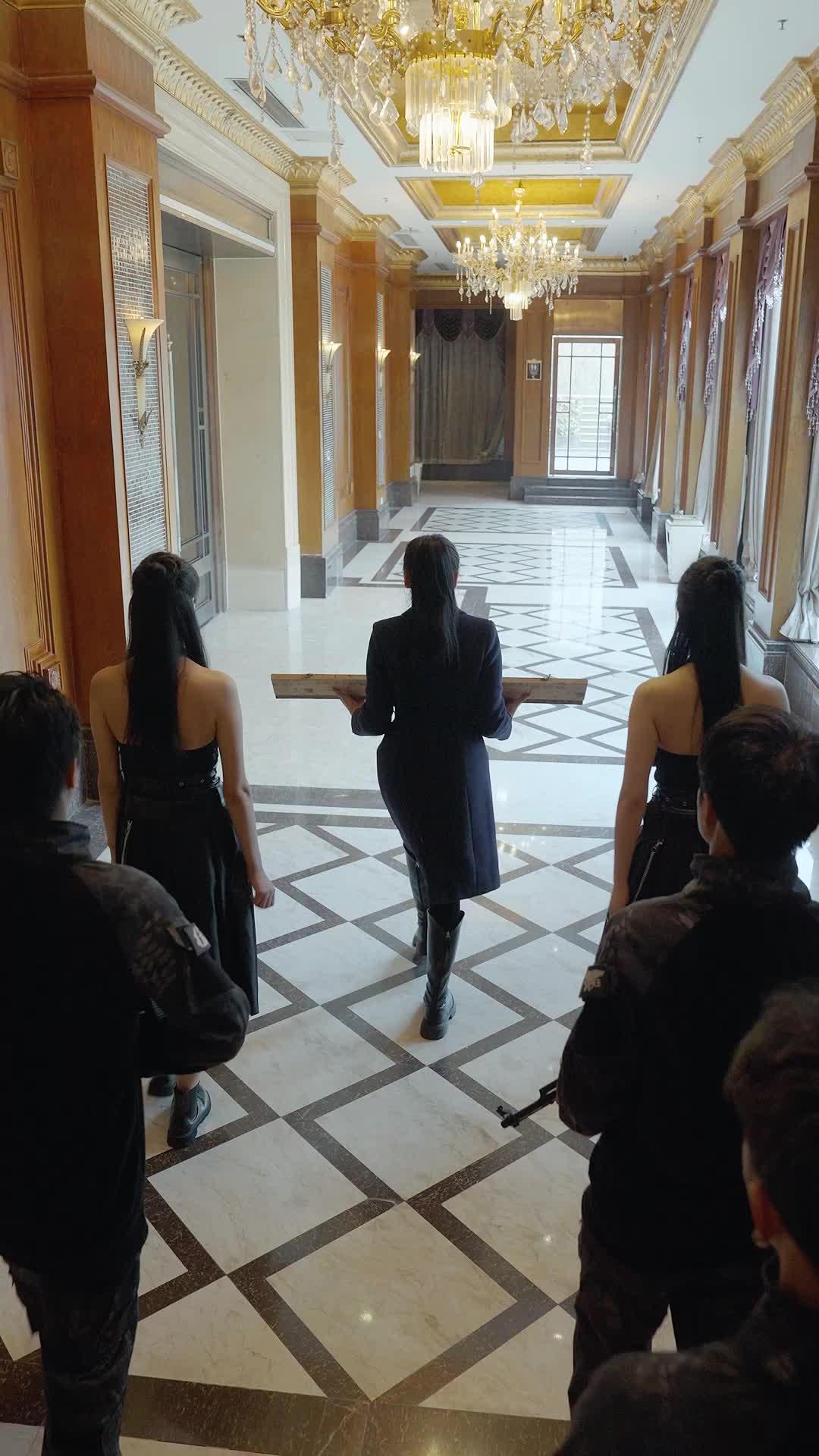 這段影像一開場,就不是尋常宴會——而是某種精心設計的「權力展演」。大理石長廊、水晶吊燈、菱形拼花地磚,每一寸空間都在低語:這裡是龍騰集團的年度招標會現場,但更像一出未標題的古裝宮鬥劇混搭現代商戰的荒誕默劇。而真正讓整場戲瞬間升溫的,是那位穿著酒紅絲絨上衣、胸前垂墜五層珍珠鏈的中年女性——她不是配角,她是導演親自點名的「情緒引爆器」。
