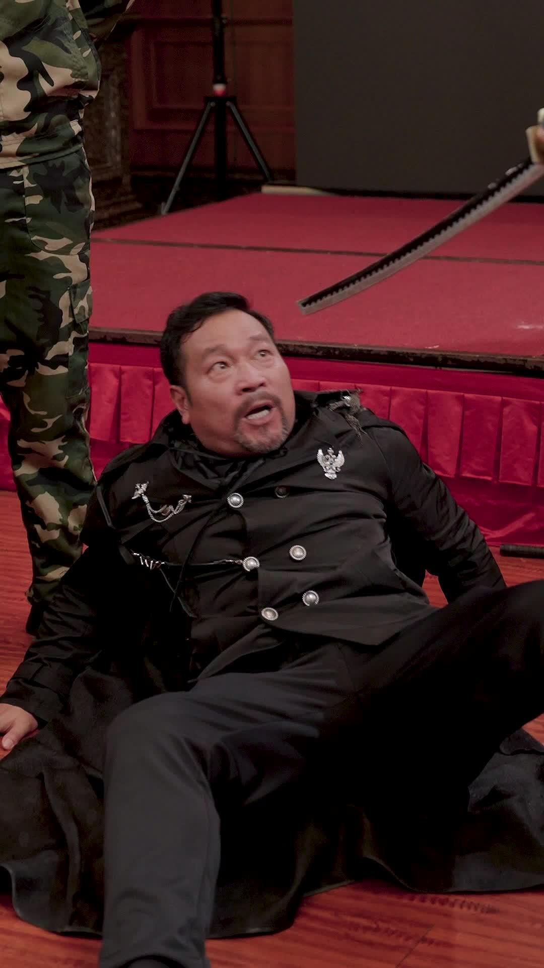 先看黑袍男子。他身著雙排扣黑緞軍式大衣,肩章鑲銀鷹徽、胸前垂墜鏈飾,頗有舊時代貴族混搭暗黑騎士的風格。但細看便知,這套服裝並非純粹威儀——左肩繡線微鬆、領口綁帶歪斜、袖口隱約汗漬,顯示他剛經歷過激烈掙扎或情緒爆發。他倒地後並未蜷縮,而是半倚後背、雙腿微張,一手撐地、一手自然垂落,像一尊被推下神壇卻仍試圖維持儀態的銅像。更關鍵的是他的眼神:從驚愕→強笑→低語→凝望,四次切換間,情緒層次極其豐富。尤其當他望向白衣女子(即那位「戰神媽媽」)時,瞳孔收縮、喉結微動,彷彿在確認某個早已預料卻不敢相信的真相。他嘴裡說的什麼?畫面無聲,但從唇形可辨「你……果然……」之類的斷句,配合他後續幾次欲言又止的顫抖,幾乎能還原出一句潛台詞:「我早該知道,你從來不是那個會跪著求饒的人。」