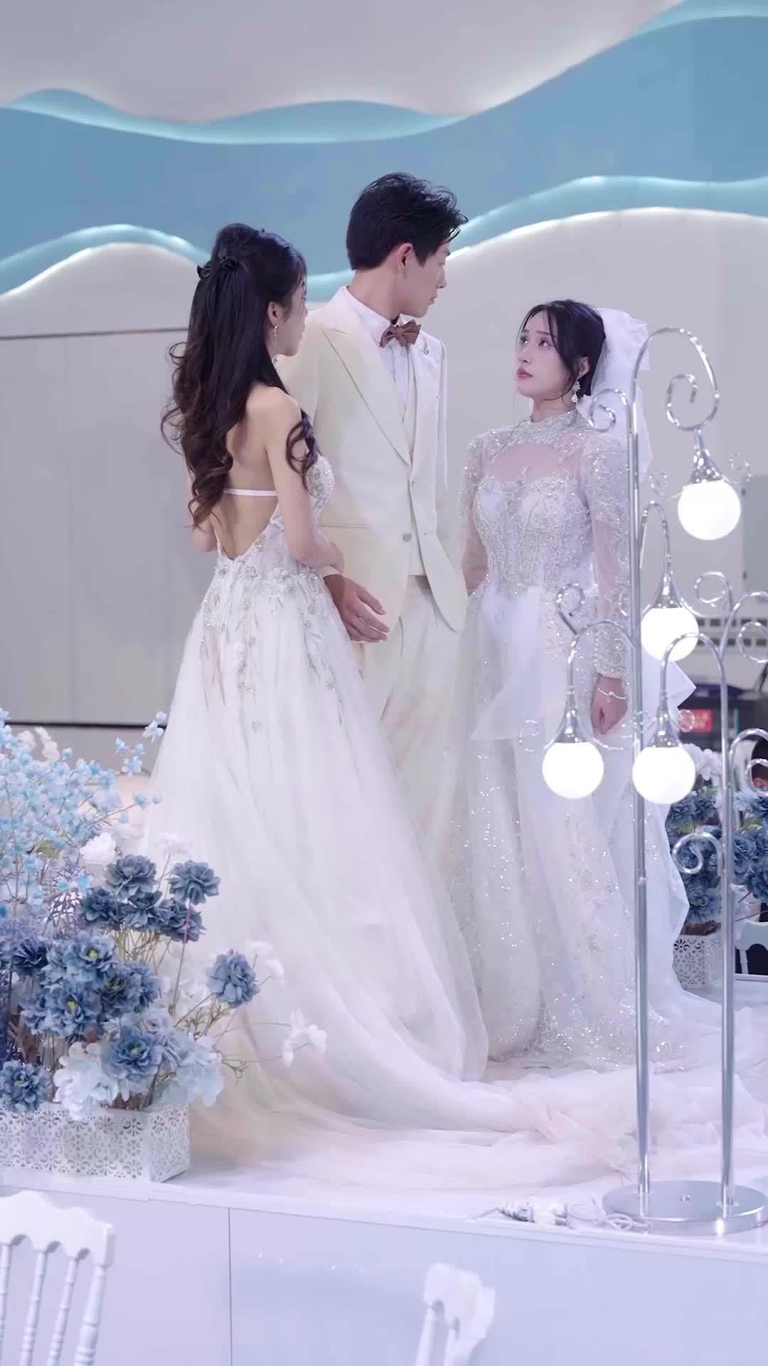這場本該溫柔如雪的婚禮,硬是被一記紅光撕開了縫隙——不是浪漫的煙火,而是魔幻現實主義的暴擊。當林燁身著米白三件式西裝、領結微揚、胸針閃爍,牽著穿露背紗裙的新娘站在階梯上時,誰能想到五分鐘後,他會跪在銀色長裙女子腳邊,手指顫抖地撫過她膝蓋上的血跡?而那抹血,竟來自他親手撕下的婚紗袖口——不,不是撕下,是「被扯落」。畫面切換間,黑袍魔師陳玄從穹頂星塵中踏步而來,肩甲泛著冷鐵光澤,額角一道赤紅符紋若隱若現,嘴角卻掛著近乎慈祥的笑。他不是闖入者,他是「預期中的意外」。觀眾席上那些穿燕尾服與旗袍的賓客,起初還舉杯低語「這特效真貴」,直到陳玄抬手,掌心浮起一團跳動的赤焰,空氣瞬間凝滯,連背景裡那幅描繪森林神殿的巨幕都開始扭曲波動——彷彿整座場館,不過是他指尖一縷餘燼。