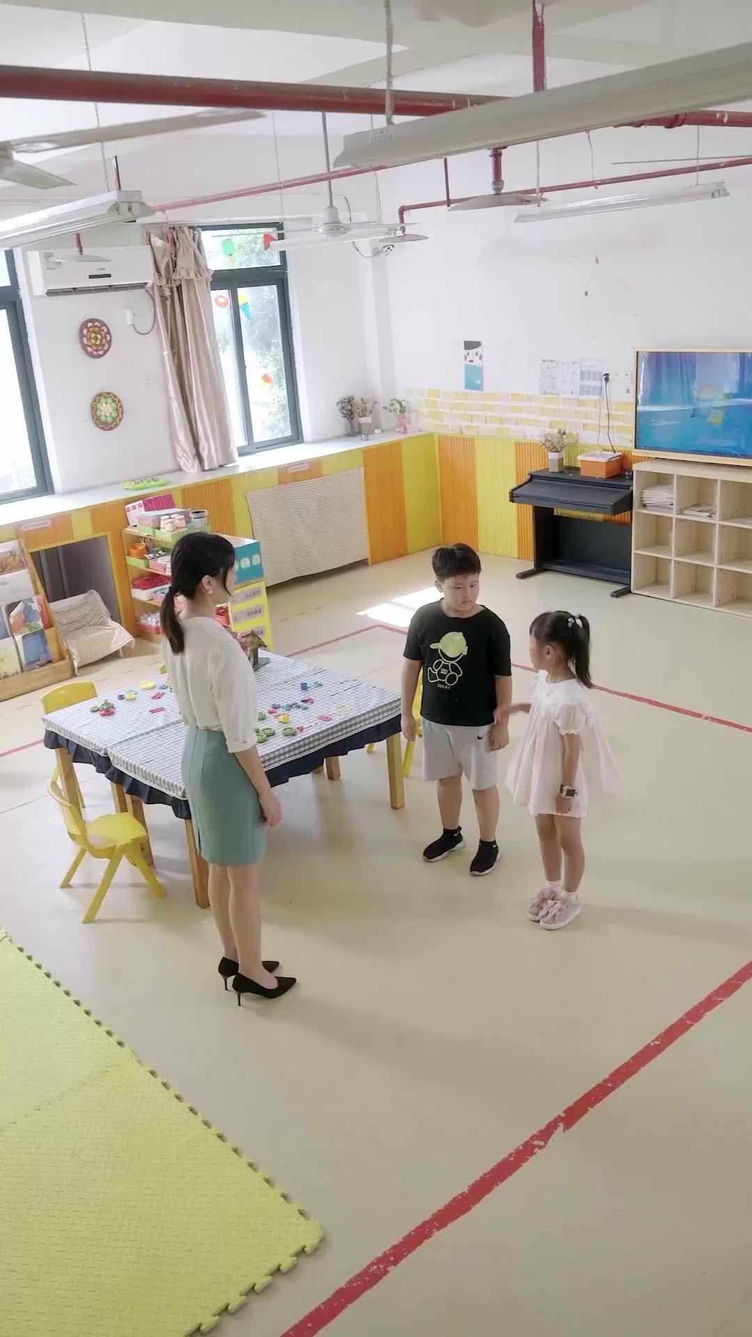 這段影像乍看是再普通不過的幼兒園日常——明亮的教室、彩色地墊、牆上貼滿童稚畫作,連空調運轉聲都像背景音般安靜。但細看之下,每一幀都藏著未說出口的劇本,尤其當「離婚後,高冷前妻夜夜數淚」這句標語悄然浮現時,整場戲瞬間從教育現場滑入情感懸疑區。王大寶,那個穿黑T恤、印著卡通熊帽圖案的小男孩,名字旁註著「熊孩子」三字,彷彿預告他將是引爆點;而站在他對面的粉裙女孩,髮尾綁著青綠色蝴蝶結,手腕戴著兒童智慧錶,眼神清澈卻不天真,她不是被動的受害者,而是潛在的敘事主導者。最關鍵的,是那位穿白襯衫、灰藍包臀裙的女教師——她不是一般意義上的「老師」,她的站姿、手勢、呼吸節奏,全都在演一齣「克制的崩潰」。開場時她雙手叉腰,眉頭微蹙,看似威嚴,實則是用身體語言築起一道防線;當小女孩伸手觸碰王大寶肩膀時,她瞳孔輕縮,喉嚨微動,那不是驚訝,是記憶被戳中的顫抖。這一幕讓人不禁想問:她是否曾在某個雨夜,也這樣伸出手,試圖攔住一個即將遠去的人?
