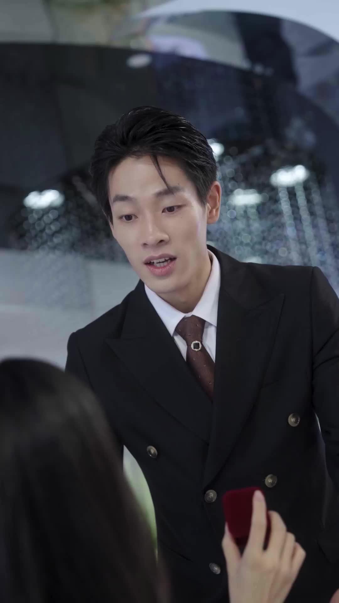 這一幕,不是劇本寫得狠,是現實太鋒利。當林晚單膝跪在純白大理石階梯上,指尖死死攥住陸沉西那條剪裁精準、垂墜感極強的黑色西褲下襬時,整座宴會廳的燈光彷彿被抽走了一半——不是暗了,是凝固了。她穿著深藍絲緞吊帶長裙,髮髻鬆散幾縷垂落頰邊,耳墜是水滴形鑽石,在頂燈下折射出細碎寒光,像她眼裡快要溢出來卻硬生生逼回去的淚。而陸沉西,站得筆直,左手插在褲袋裡,腕表錶盤泛著冷銀色澤,右手還捏著那個打開的紅絨戒盒,盒內空空如也。他沒低頭看她,視線越過她肩頭,落在對面那位穿黑鑲白亮片禮服、頸間疊戴三層鑽石項鍊的蘇綰身上。蘇綰唇角微揚,笑意未達眼底,指尖輕撫過自己鎖骨處一顆鑲鑽蝴蝶結飾品,那姿態,像在欣賞一件剛完成的藝術品,而非一場正在崩塌的婚姻殘骸。