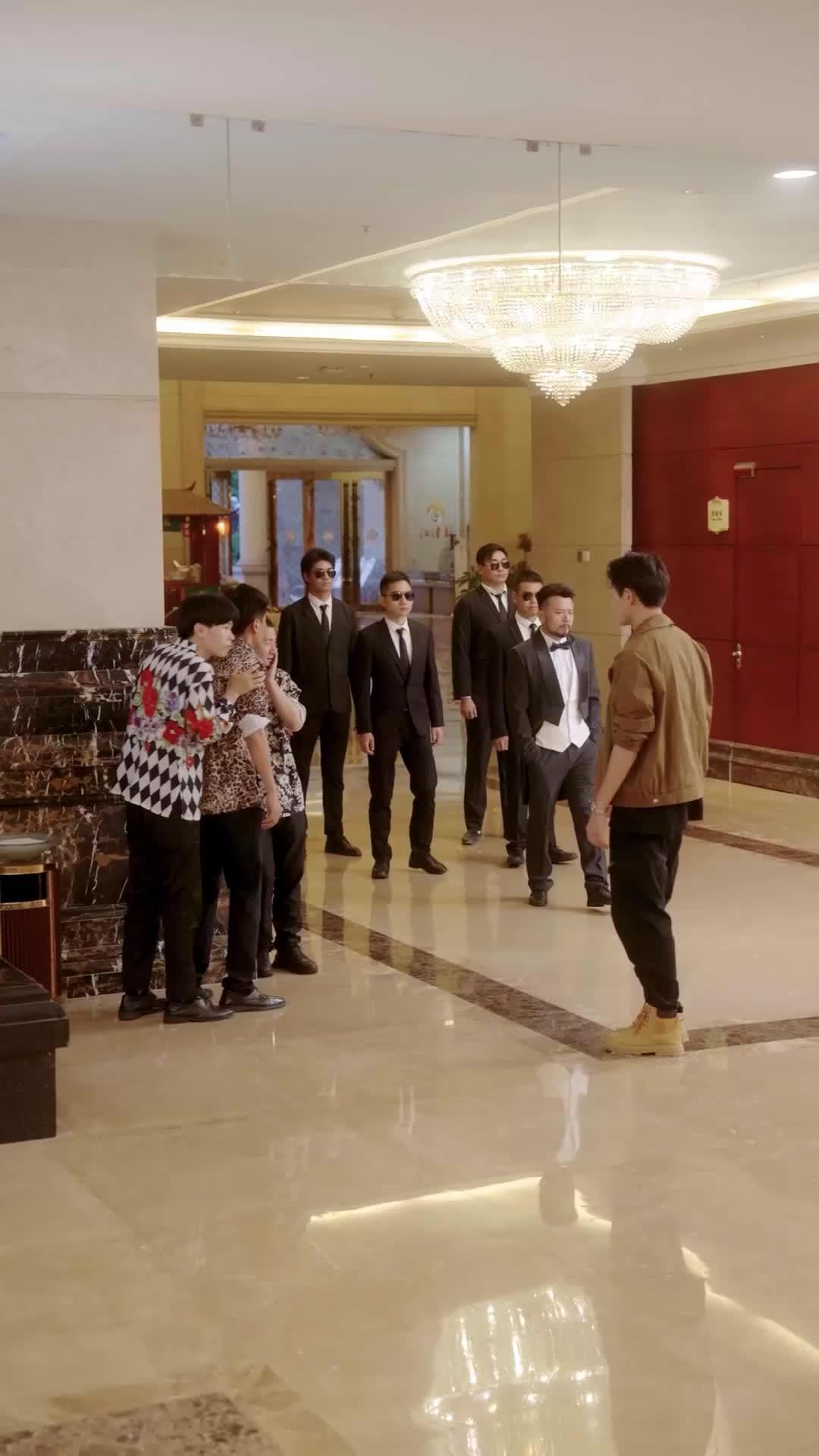 你有沒有試過,在一場看似體面的聚會裡,突然聽見一句話,讓你全身血液倒流?這段影像就捕捉了那種「一秒世界崩塌」的瞬間——不是爆炸,不是槍聲,是一個穿燕尾服的男人,緩緩把手從口袋裡抽出來,指尖沾著一粒灰塵,像在擦拭某段被掩埋的記憶。場景設定在豪華酒店大堂,大理石地面光可鑑人,倒映著水晶吊燈的碎光,也倒映著七個人的腳步:四個黑西裝墨鏡男如影隨形,一個穿酒紅三件套的青年阿燁站姿筆挺,一個豹紋襯衫的阿豹手勢激動,還有一對男女——卡其外套的小舟與粉霧色禮服的女子,他們站得最近,卻像隔著整片太平洋。