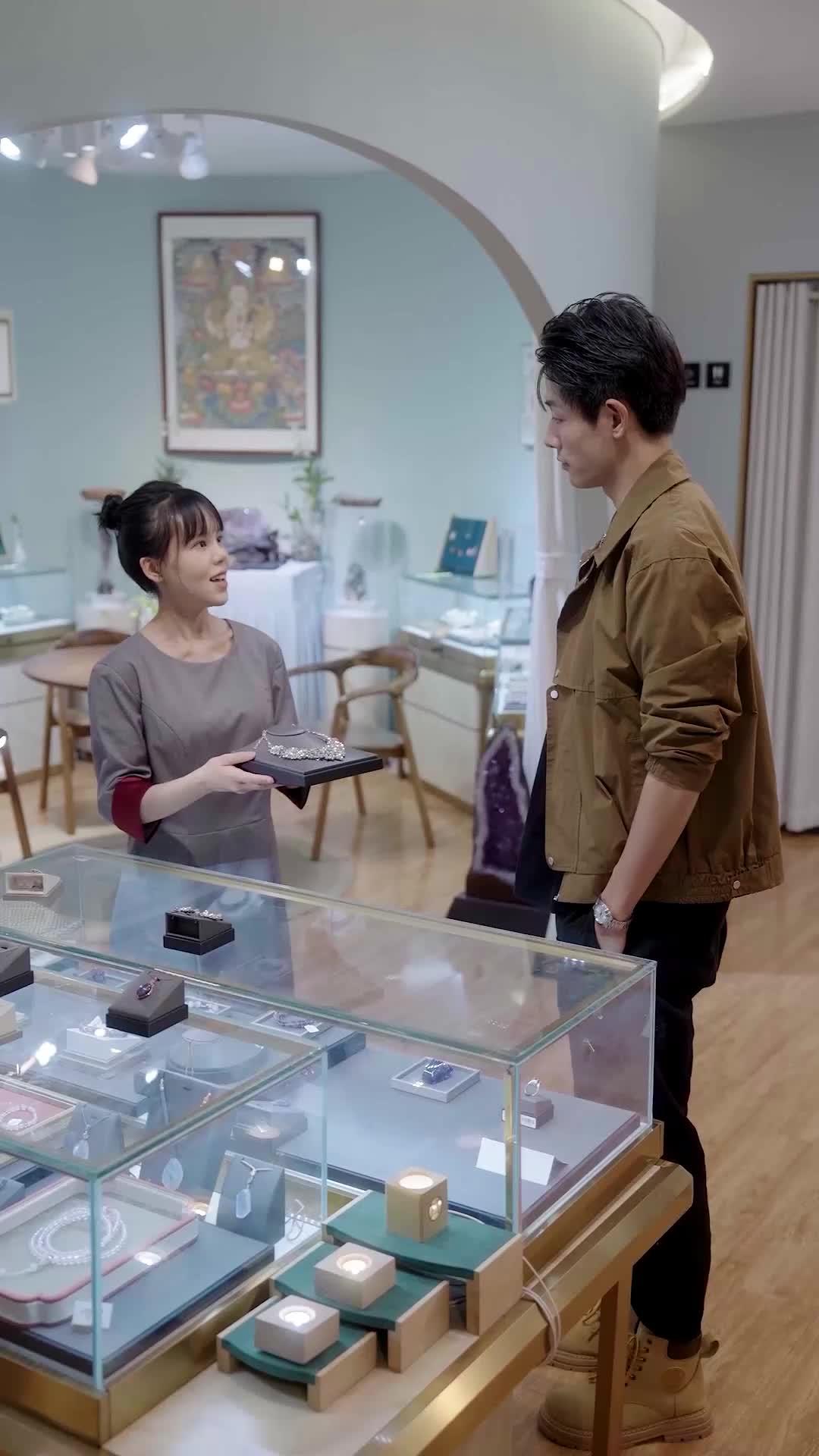 這段影像乍看是珠寶店日常,實則是一場精心編排的「情感解剖儀式」。當林晚(穿灰裙的年輕女店員)將那條鑲滿碎鑽的頸鏈托盤遞出時,她的指尖微微顫抖——不是因緊張,而是她認出了那條項鍊的款式:三年前,陳硯在婚禮前夕為她訂製的「星塵之吻」,原版早已隨離婚協議被封存於保險庫。而此刻,它竟出現在另一個女人手中,且由那位穿卡其外套、戴銀鏈的男子親自挑選。這不是巧合,是伏筆,是導演埋下的第一枚情感地雷。
