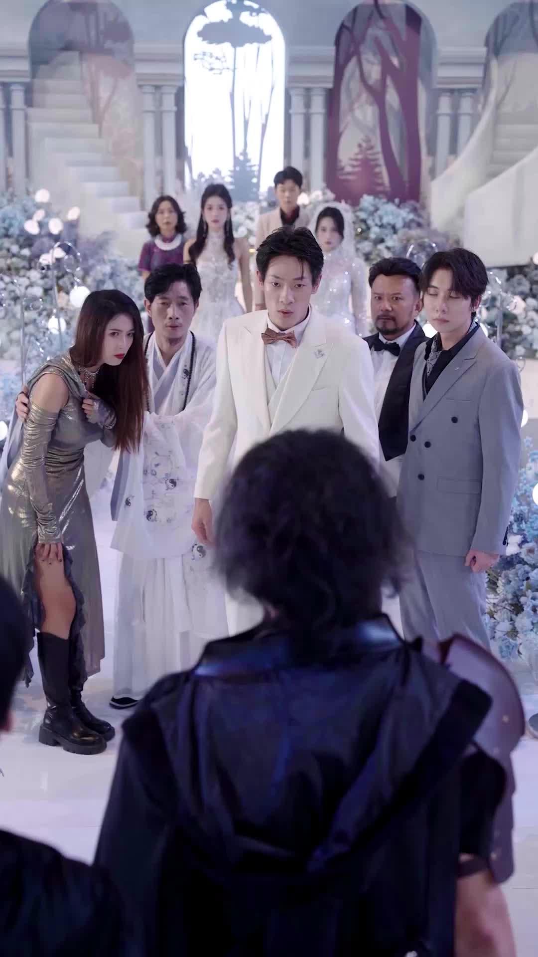 林修遠的反應極其耐人尋味。他沒有立刻拔劍,反而先轉頭看了眼身後穿灰西裝的陳硯舟——那位始終沉默、手指緊扣腰側的伴郎。陳硯舟的眼神像冰層下的暗流,既警覺又壓抑。他與林修遠之間,有太多未說出口的默契與裂痕。當蘇九淵第一波靈壓爆發時,陳硯舟竟下意識伸手按住林修遠手臂,低聲一句:「還不到時候。」這句話輕如耳語,卻比任何打鬥都更令人毛骨悚然。它暗示這場對峙早有預謀,甚至可能是林修遠默許的「儀式」。而穿銀色開衩禮服、腳踩厚底靴的莫璃,則緊抓著另一位白衣道袍男子的手臂——那人正是當年與沈知微同門、如今卻站在敵方陣營的裴玄機。莫璃的指甲幾乎掐進裴玄機肉裡,她嘴脣翕動,似在祈禱,又似在詛咒。她的存在,像一枚被遺忘的棋子,突然被推上棋盤中央。