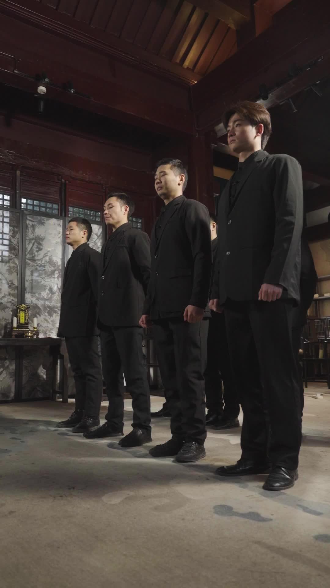 The scene opens not with fanfare, but with silence—thick, reverent, almost suffocating. Five men in identical black suits kneel in unison on a worn concrete floor, their postures rigid yet trembling at the edges, as if holding back something far more volatile than grief. Their hands are clasped before them, fingers interlaced like prayer beads, eyes downcast—not out of shame, but discipline. This is not a funeral. It’s a ritual. A vow. And behind them, standing like twin sentinels against a backdrop of ink-washed mountain murals and lacquered wood, are two figures who command the room without uttering a word: Li Wei, the broad-shouldered elder with the dragon-patterned shawl and amber-tinted glasses, and Xiao Lan, the woman whose presence alone seems to recalibrate gravity in the space. She wears black—not mourning black, but *authority* black: a high-collared tunic layered over a leather vest stitched with white calligraphic flourishes that look less like decoration and more like binding sigils. Her hair is pulled back with a single wooden hairpin shaped like a coiled serpent, its tail curling just above her ear—a detail that lingers long after the frame cuts away.