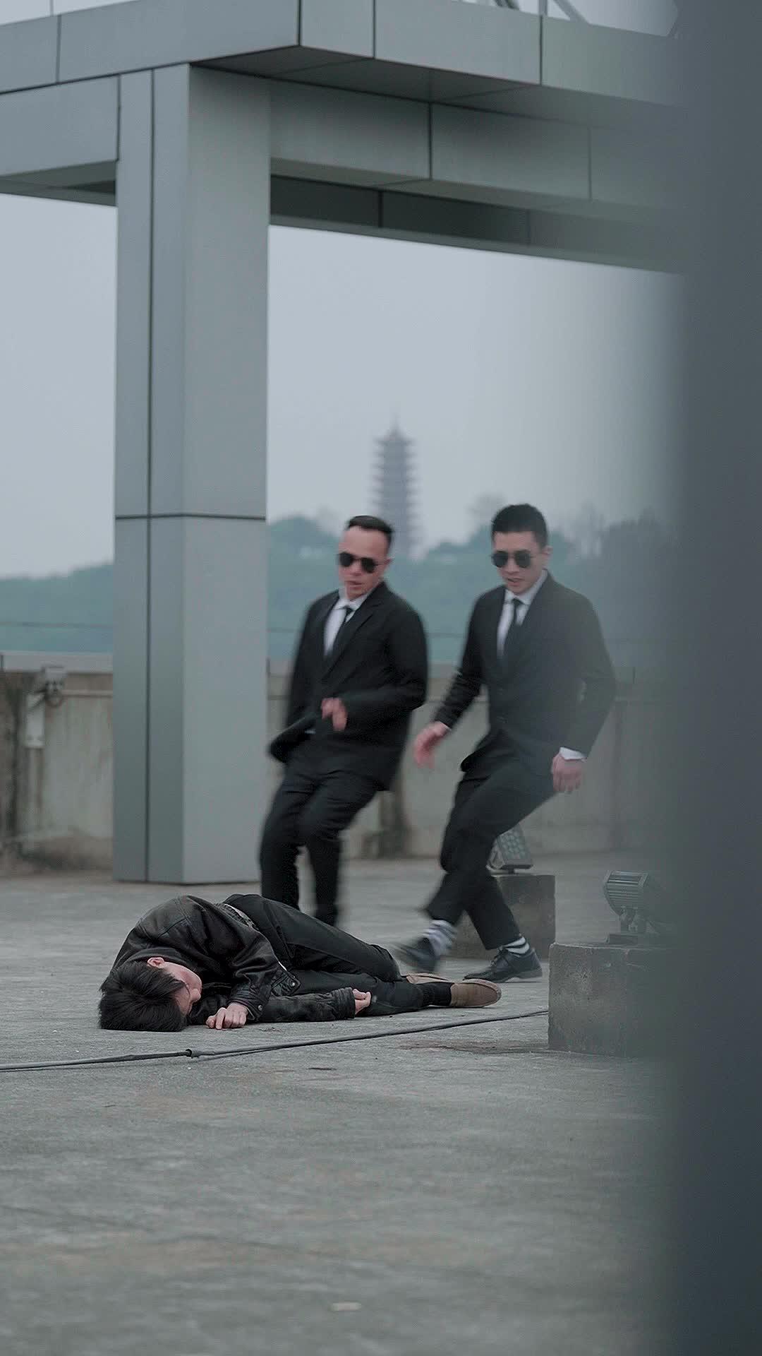 The opening shot of this sequence is not a chase, not a fight—it’s a stillness that breathes like a held breath before the storm. A man lies motionless on cold concrete, his black leather jacket crumpled beneath him, one arm splayed as if he’d tried to catch himself mid-fall. Two men in tailored black suits stride toward him—not with urgency, but with the calm precision of executioners who’ve done this before. Their sunglasses aren’t for style; they’re armor against empathy. One kneels, fingers brushing the unconscious man’s temple—not to check for a pulse, but to confirm identity. Then he pulls out a phone. Not to call for help. To report. To log. To erase.