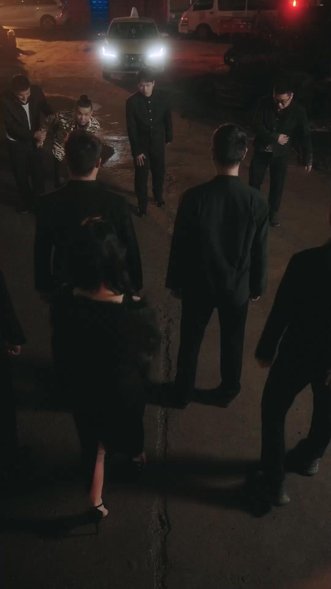 Night falls over a dimly lit industrial alley, where puddles reflect the harsh glare of a taxi’s headlights—its presence not just incidental but symbolic. The scene opens with a tight circle of men in black suits, their postures rigid, their silence heavy. At the center stands Ms. Cinderfell, draped in a black gown with feathered shoulders and silver-dangling earrings that catch the faintest glint of ambient light. Her posture is composed, arms crossed, yet her eyes betray a flicker of something deeper—not fear, not anger, but calculation. She is not here to negotiate; she is here to assess. And what she assesses is a man on his knees, wearing a tiger-striped jacket that screams defiance even as his body begs for mercy. His name? Hauler Lee—a lousy taxi driver, according to his accusers, but the way he speaks, the way he gestures, the way he *dares* to look up at her while trembling… suggests otherwise.