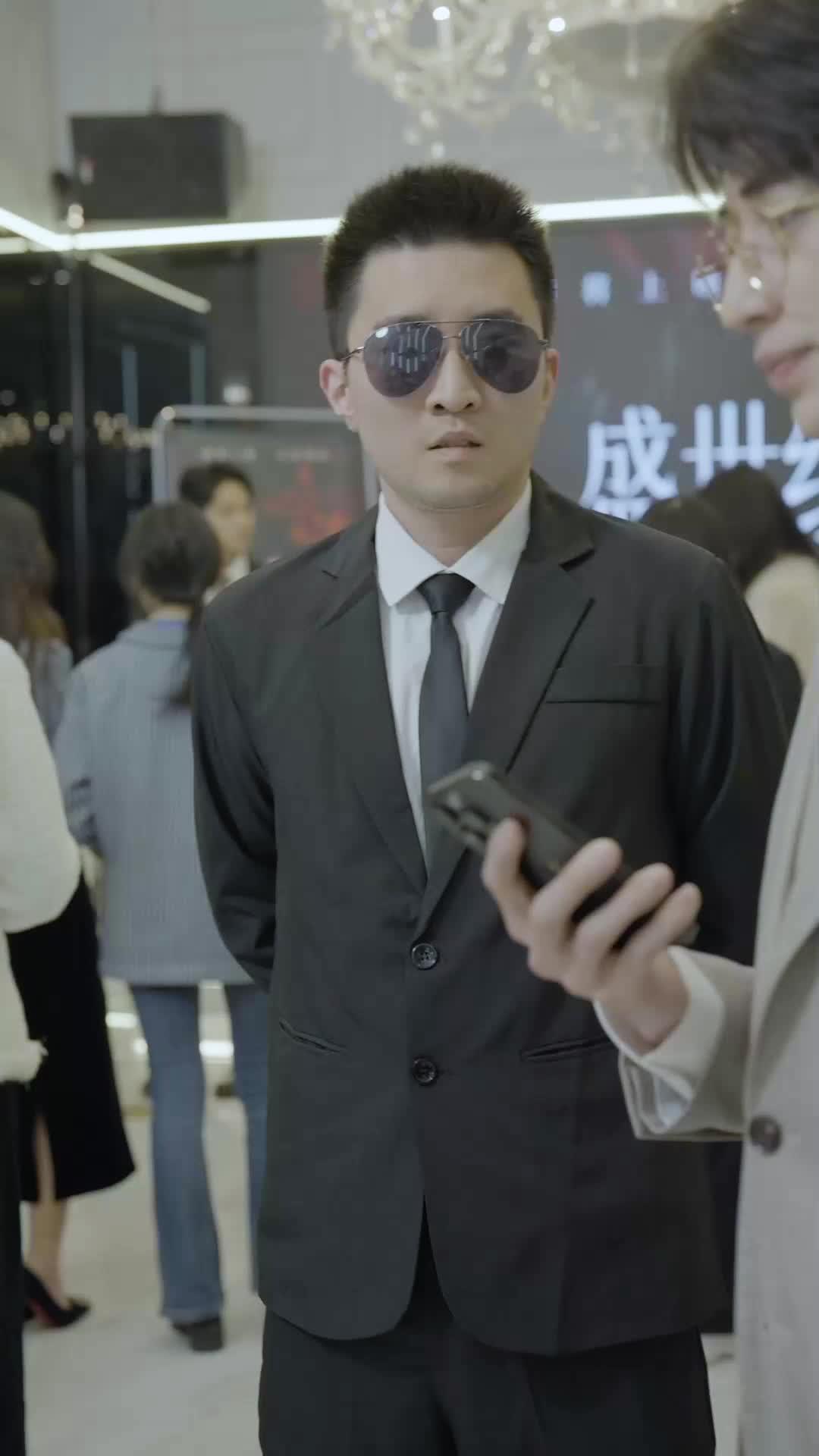 In the glittering, chandelier-draped hall of what appears to be a high-end promotional event for the short drama *The Radiant Road to Stardom*, the air hums not with applause, but with unspoken tension—a subtle current running beneath the polished veneer of champagne flutes and designer suits. The scene opens with Lin Zeyu, sharply dressed in a black double-breasted suit and aviator sunglasses, standing like a sentinel beside his companion, who holds a smartphone as if it were a weapon or a shield. His posture is rigid, his expression unreadable—yet the faint tightening around his jaw suggests he’s bracing for something. This isn’t just an attendee; he’s a gatekeeper, perhaps even a bodyguard, though his role feels more psychological than physical. He doesn’t speak, yet his silence speaks volumes: this is a world where every glance carries weight, every pause is a calculated risk.