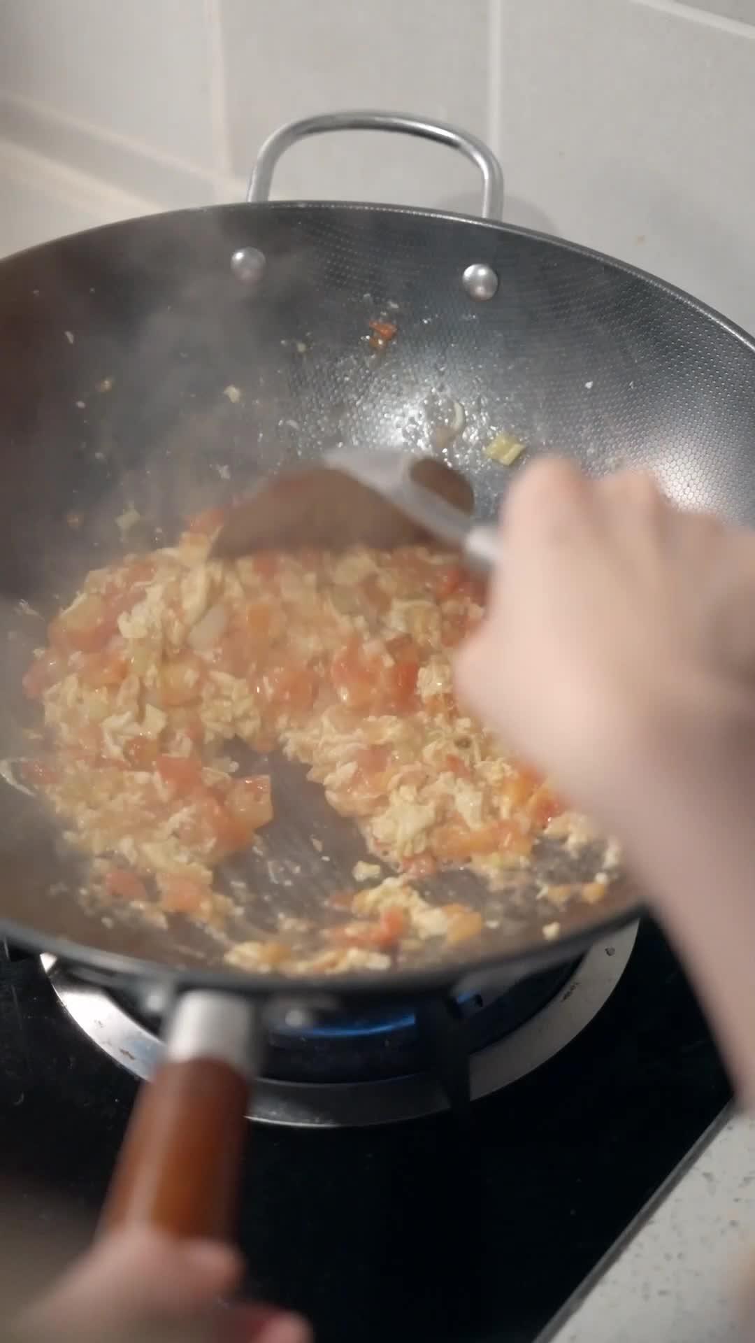In the quiet hum of a modern kitchen, where tiled walls reflect soft LED light and the scent of simmering tomatoes lingers like an unspoken confession, we witness not just a meal being prepared—but a performance of restraint, vulnerability, and subtle emotional choreography. The opening shot—a wok over blue flame, eggs and diced tomatoes swirling in rhythmic chaos—sets the tone: this is not merely cooking; it’s alchemy. Every stir of the wooden spoon by Lin Xiao, her fingers steady yet trembling at the edges, speaks volumes about the weight she carries beneath her corduroy sweater and denim overalls. Her outfit, deliberately casual yet curated—soft beige, practical pockets, a small white label stitched near the chest—suggests someone who values authenticity but still performs for an audience she hasn’t fully acknowledged. She stirs with focus, but her eyes flicker upward, not toward the stove, but toward the doorway, as if anticipating a presence that has already begun to reshape the air around her.