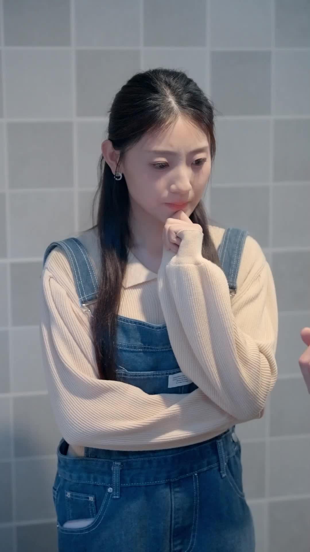 In the quiet hum of a modern kitchen—tiled in soft gray, lit by cool LED under-cabinet glow—two people orbit each other like celestial bodies caught in a gravitational dance neither fully understands yet. The woman, Lan Xi, stands with her arms folded, fingers curled around her own wrist, eyes darting between the man before her and the red tomato he holds like a sacred relic. Her posture is defensive, yes—but not hostile. It’s the kind of guardedness that comes from having been burned before, or perhaps just from knowing how easily affection can be mistaken for obligation. She wears denim overalls over a cream ribbed sweater, practical but tender, like someone who still believes in comfort as a form of love. Her earrings are simple silver hoops, catching light when she tilts her head—tiny mirrors reflecting the uncertainty in her gaze.