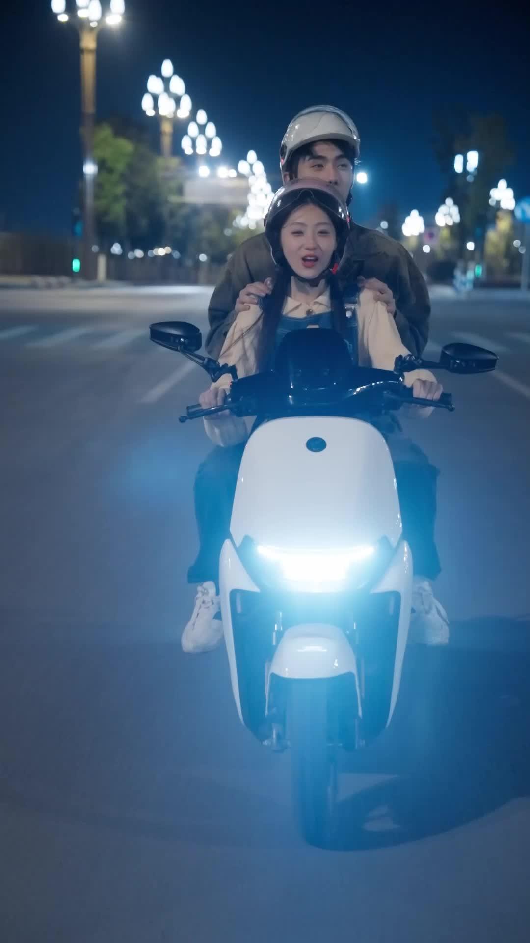 There’s something quietly magnetic about the way Li Wei grips the handlebars—not with tension, but with the kind of relaxed certainty that only comes from having driven this road before. His white helmet gleams under the streetlights like a beacon, while behind him, Xiao Yu clings not out of fear, but out of habit—her fingers curled into the fabric of his jacket, her breath catching just slightly as the scooter leans into the curve. The city blurs past them in streaks of sodium-vapor gold and LED blue, but their world is contained within the radius of the headlight’s beam: two people, one machine, and the unspoken pact that tonight, for once, they’re moving forward together. This isn’t just a ride—it’s the first act of a slow-motion confession. In *The Radiant Road to Stardom*, every gesture is calibrated to reveal more than dialogue ever could. When Li Wei spreads his arms wide at the intersection, shouting something lost to the wind, Xiao Yu doesn’t flinch. She laughs instead—her mouth open, eyes crinkled, teeth catching the light—and for a heartbeat, she looks less like a girl caught between choices and more like someone who’s finally remembered how to fly. That moment is the film’s thesis: joy isn’t the absence of uncertainty; it’s the courage to laugh *while* still holding on.